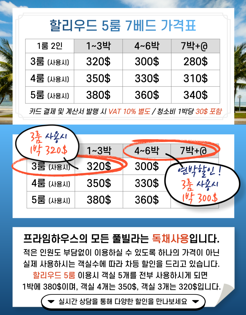 • 명절,연말,연초 등 특정기간에는 연휴가격 10~15% 인상이 있습니다.