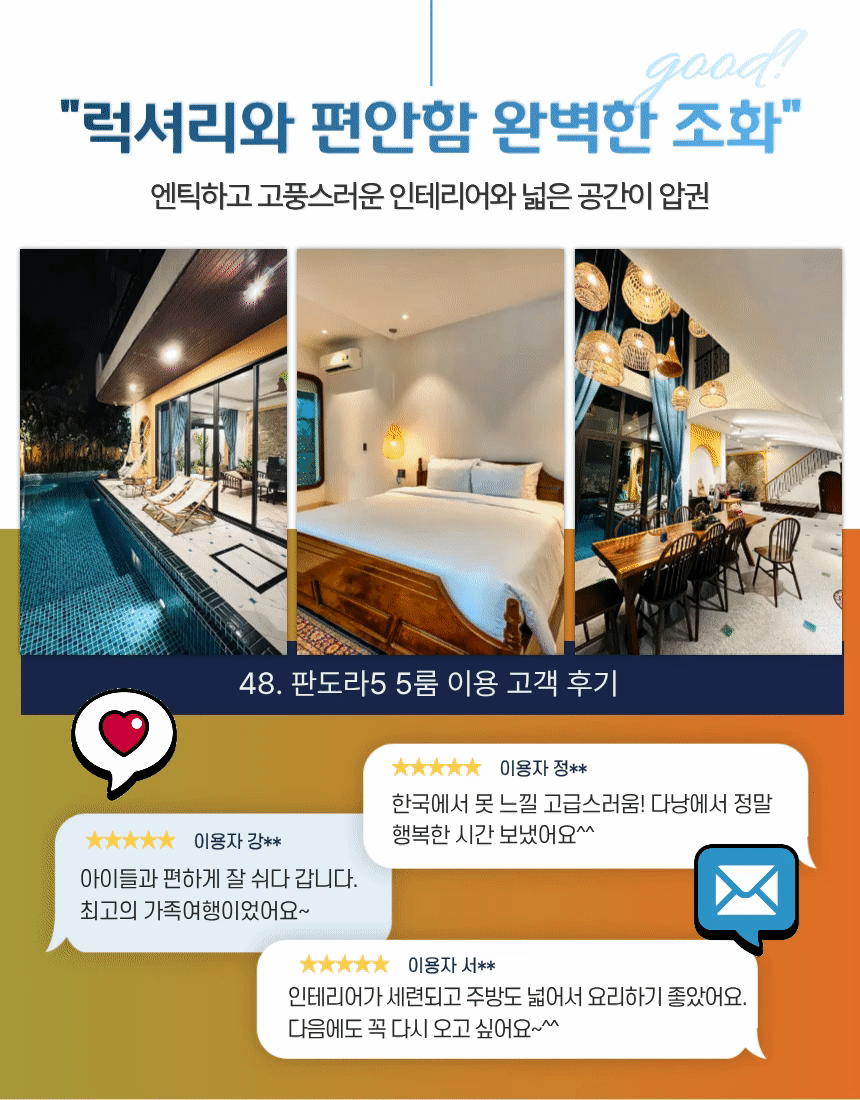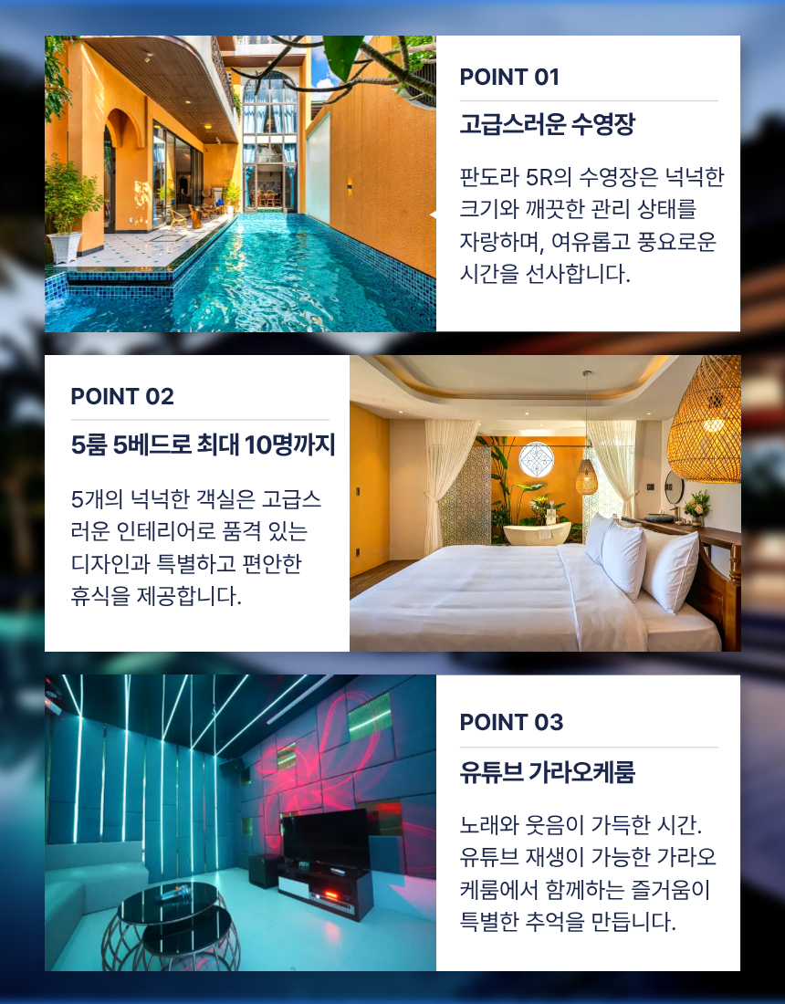 | 공항 픽업 / 샌딩 서비스 | 다낭 공항 → 풀빌라 간 전용 차량 이동 | 유튜브 구독 & 네이버 카페 회원 전용 |