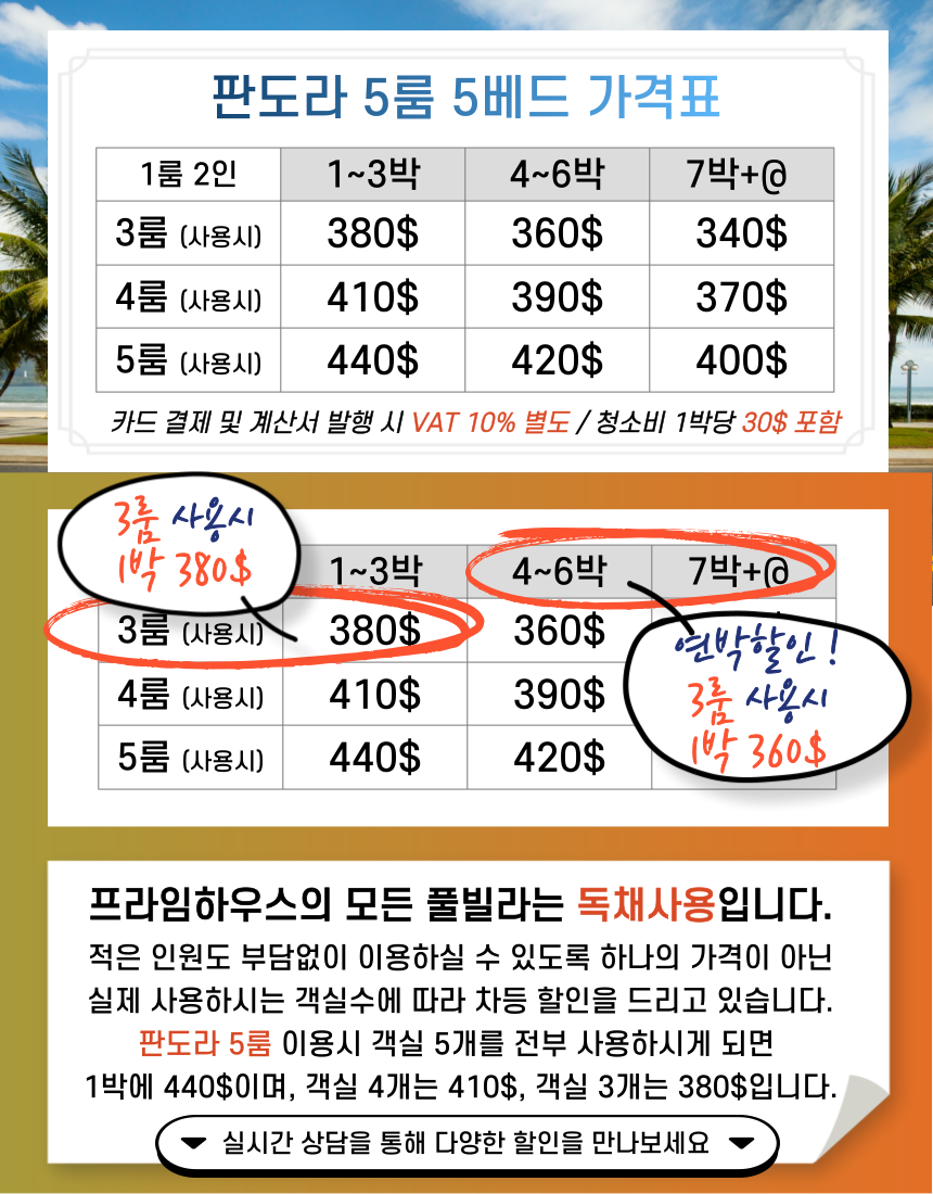 • 담당자와 실시간 상담을 통해 최종 견적과 할인이 담긴 인보이스를 받은 뒤 결제해주세요. (풀빌라 외에 골프, 렌터카, 비비큐, 조식, 가이드, 핫플레이스 등)