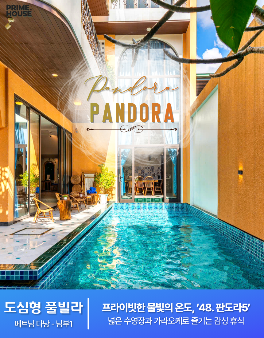 ‘48. 판도라5’는 5룸 · 5베드 · 7욕실로 구성된 4층 구조의 도심형 프리미엄 풀빌라입니다. 외부 수영장(10m × 3m × 1.5m)이 거실·주방과 자연스럽게 이어져 있어 물놀이 후 휴식·식사 동선이 매우 단순하며, 1층 가라오케룸(유튜브 재생 가능)과 BBQ존을 한 층에서 함께 이용할 수 있어 낮과 밤 모두 활용도가 높습니다. 오렌지톤 외벽과 세련된 타일 패턴이 이국적인 분위기를 더하며, 내부는 밝고 단정한 톤으로 구성되어 가족·친구 단위 여행객에게 안정적인 체류 환경을 제공합니다.