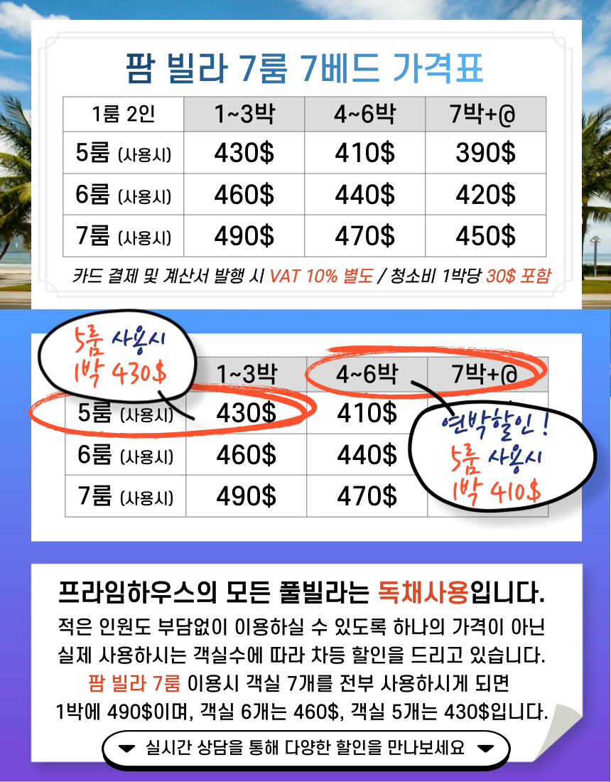 • 기본 요금은 5룸 사용시 1박 요금 (VAT 포함) 입니다.