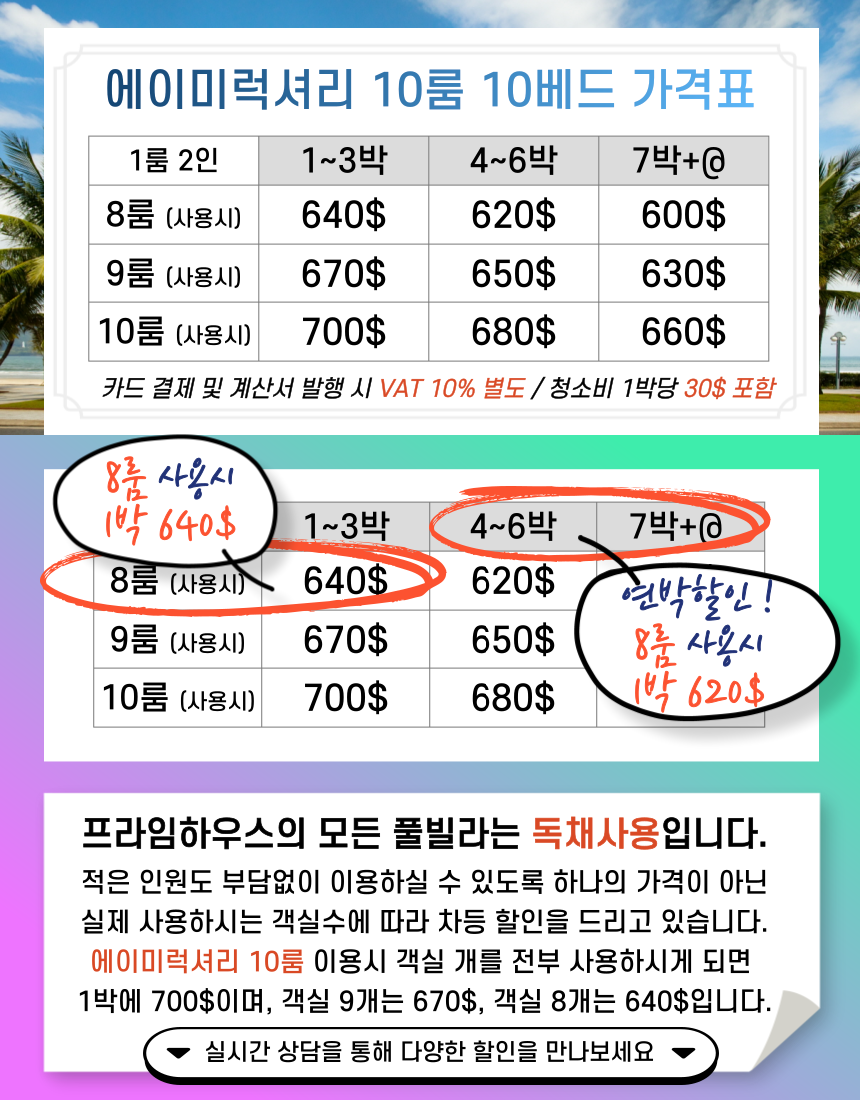 • 명절,연말,연초 등 특정기간에는 연휴가격 10~15% 인상이 있습니다.