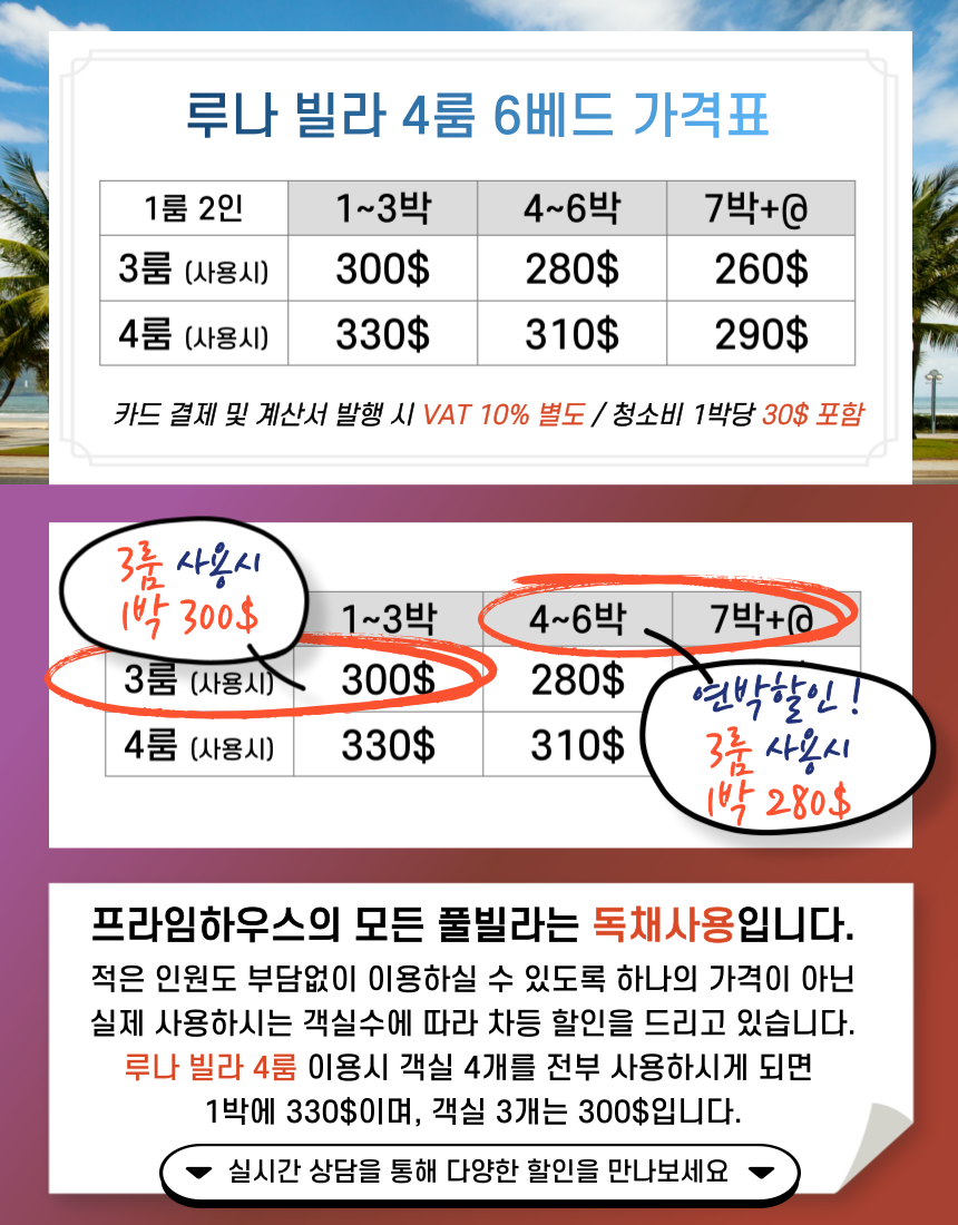 • 기본 요금은 3룸 사용시 1박 요금 (VAT 포함) 입니다.