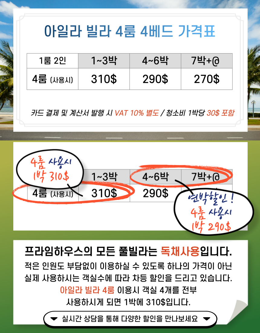 • 담당자와 실시간 상담을 통해 최종 견적과 할인이 담긴 인보이스를 받은 뒤 결제해주세요. (풀빌라 외에 골프, 렌터카, 비비큐, 조식, 가이드, 핫플레이스 등)