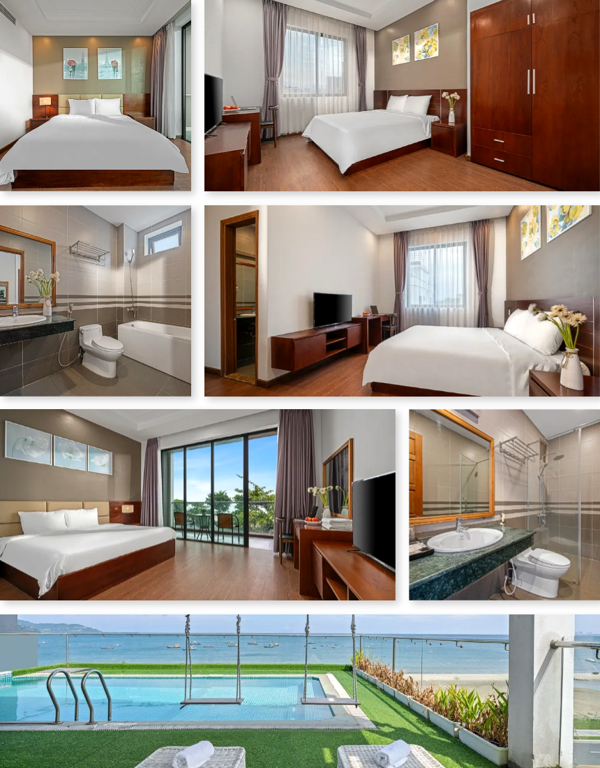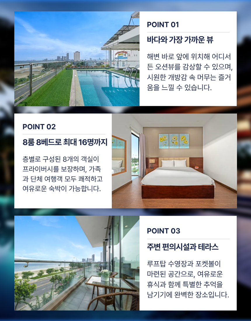 객실은 총 8개로 모두 내부 욕실을 갖춘 형태라 여러 인원이 함께 이용해도 불편함이 적습니다. 루프탑 수영장은 오션뷰와 함께 개방감이 뛰어나며, 아침에는 시원한 바다 전망을, 저녁에는 잔잔한 노을을 즐길 수 있어 여행 만족도를 높여줍니다. 미케해변·한시장·한인타운까지 차량 약 5~10분 거리에 위치해 해변 일정·관광·식사 동선도 수월한, 입지·시설·프라이버시 균형이 잘 잡힌 도심형 풀빌라입니다.