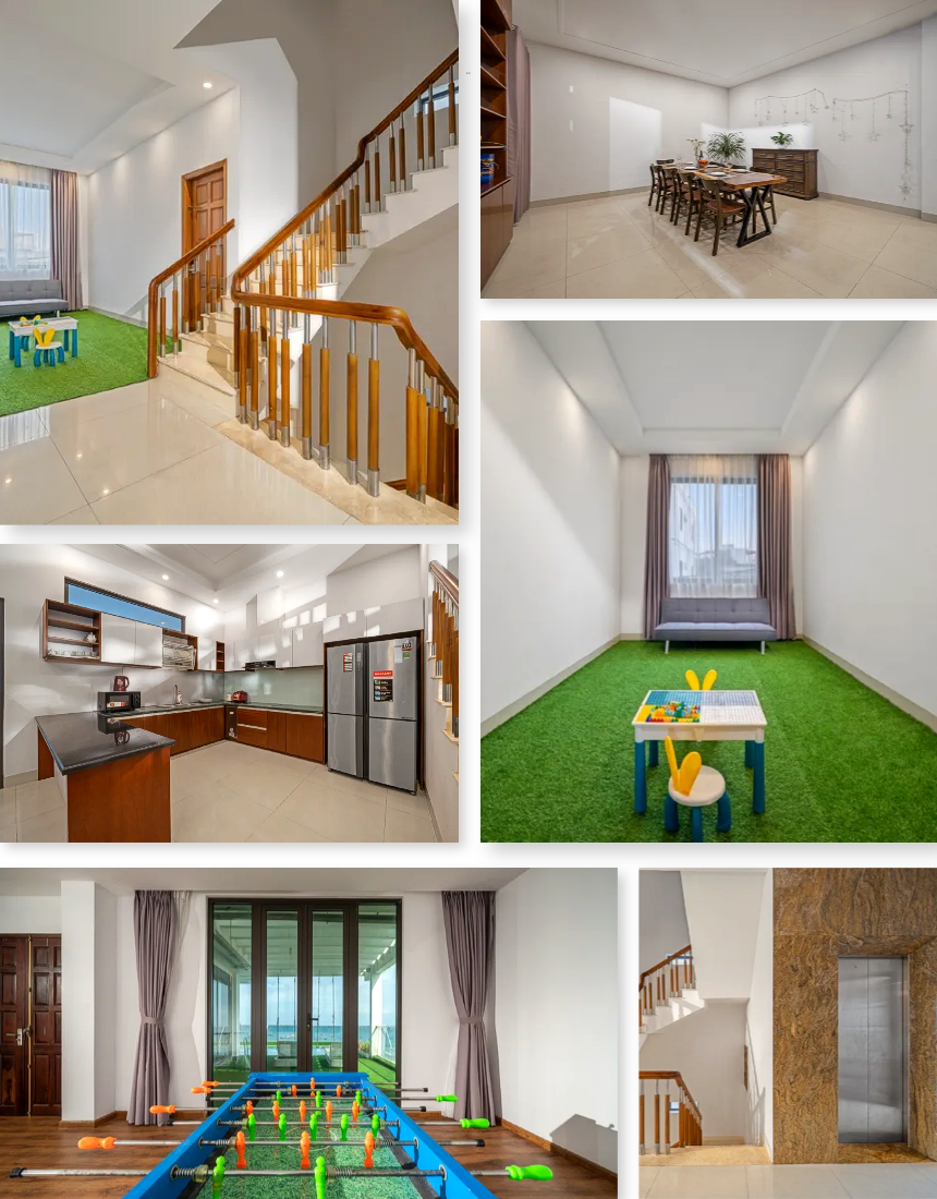 ‘31. 비치 프론트’는 8룸·8베드·8욕실로 구성된 4층 규모의 프리미엄 도심형 풀빌라로, 루프탑 수영장에서 바다를 정면으로 바라볼 수 있는 점이 가장 큰 매력입니다. 1층에는 거실·주방·포켓볼룸·세탁 공간이 배치되어 있어 공용 활동이 한 층에서 자연스럽게 이어지며, 엘리베이터가 설치되어 짐 이동이나 층간 이동 부담을 줄여줍니다. 우드톤과 화이트 조합의 인테리어는 밝고 깔끔한 분위기를 유지해 일행 전체가 편안하게 머무를 수 있는 구조입니다.