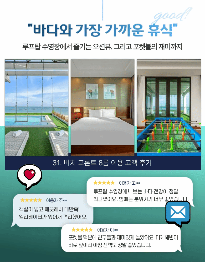 루프탑 수영장은 바다를 정면으로 바라보는 구조로 개방감이 뛰어나며, 숙소 안에서도 휴양지 분위기를 그대로 느낄 수 있습니다. 9.4m 길이의 수영장은 물놀이·휴식·사진 촬영에 모두 적합하고, 아침의 밝은 해변 전망과 저녁 노을이 시간대별 다른 매력을 제공합니다. 해변과 가까운 입지와 결합해 실내·실외 어느 공간에서도 바다 감성이 자연스럽게 이어집니다.