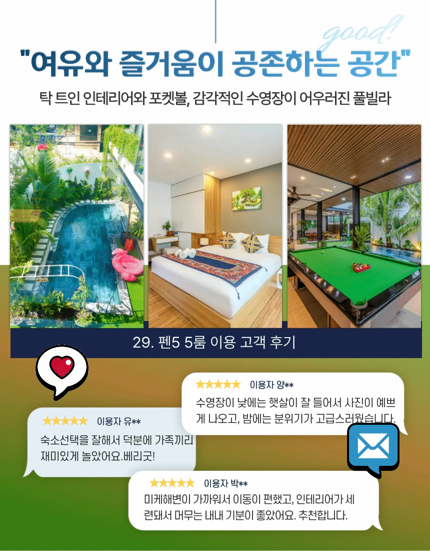 ‘29. 펜5’는 5룸 · 6베드 · 6욕실 구성의 3층 프리미엄 도심형 풀빌라로, 넓고 개방감 있는 수영장과 포켓볼룸을 중심으로 여유로운 휴식 공간을 제공합니다. 1층 실외 수영장(7.6m × 4.5m × 1.6m)은 폭이 넓어 가족·친구 단위의 단체가 이용하기에 적합하며, 거실·주방과 자연스럽게 연결된 동선은 사용 편의성을 높여줍니다. 따뜻한 조명과 화이트톤·우드톤이 조화를 이루는 인테리어는 머무는 동안 편안하고 감각적인 분위기를 유지시키며, 층별 객실 배치 구조는 프라이버시를 효과적으로 확보합니다.