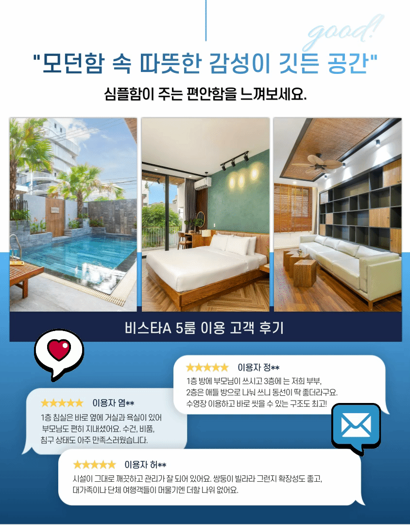 • 담당자와 실시간 상담을 통해 최종 견적과 할인이 담긴 인보이스를 받은 뒤 결제해주세요. (풀빌라 외에 골프, 렌터카, 비비큐, 조식, 가이드, 핫플레이스 등)