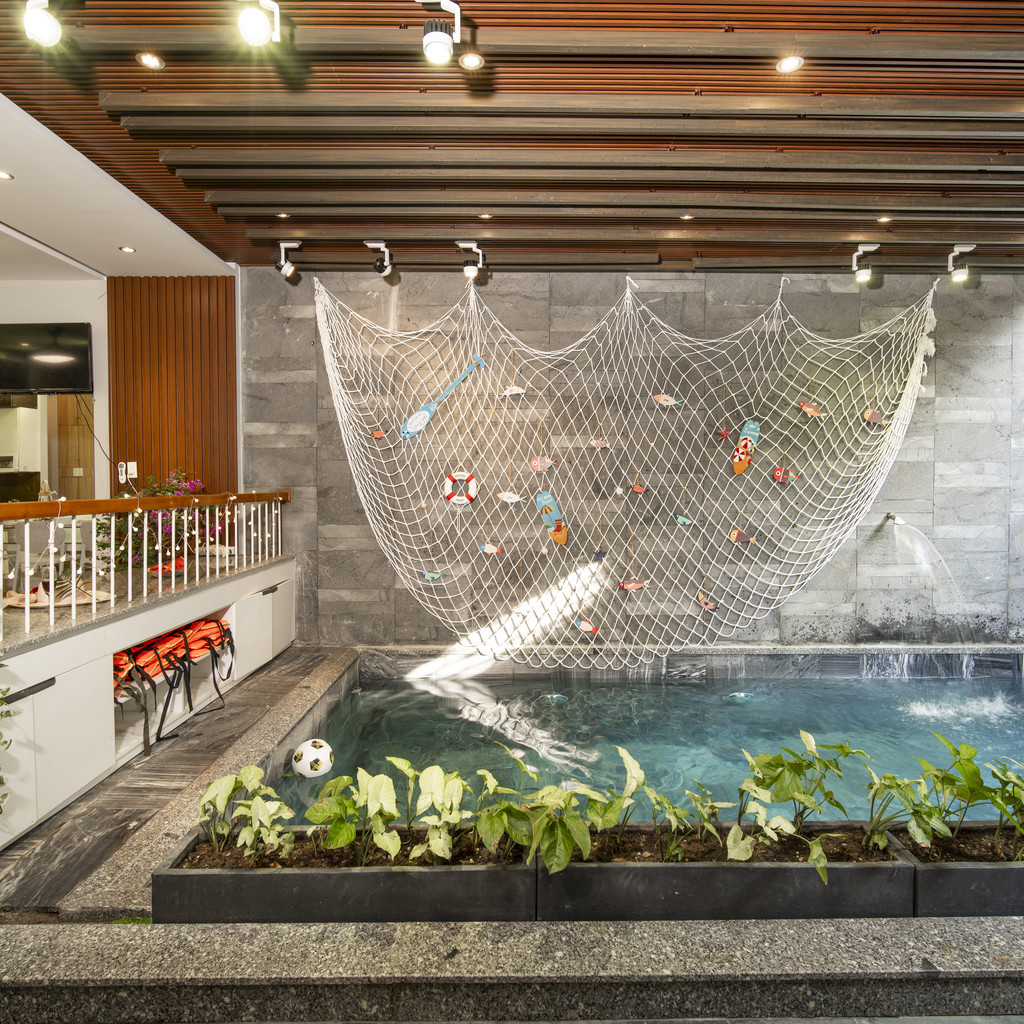 라비의 실외 수영장(5m × 4.6m × 1.6m)은 천창과 그린월이 조화를 이루어 낮에는 자연광을 가득 담고 밤에는 은은한 조명으로 분위기가 달라집니다. 거실과 가까운 구조라 아이를 돌보며 수영을 즐기기 좋고, 전체적으로 개방감이 뛰어나 도심 안에서도 자연 속 휴식을 느낄 수 있습니다.
