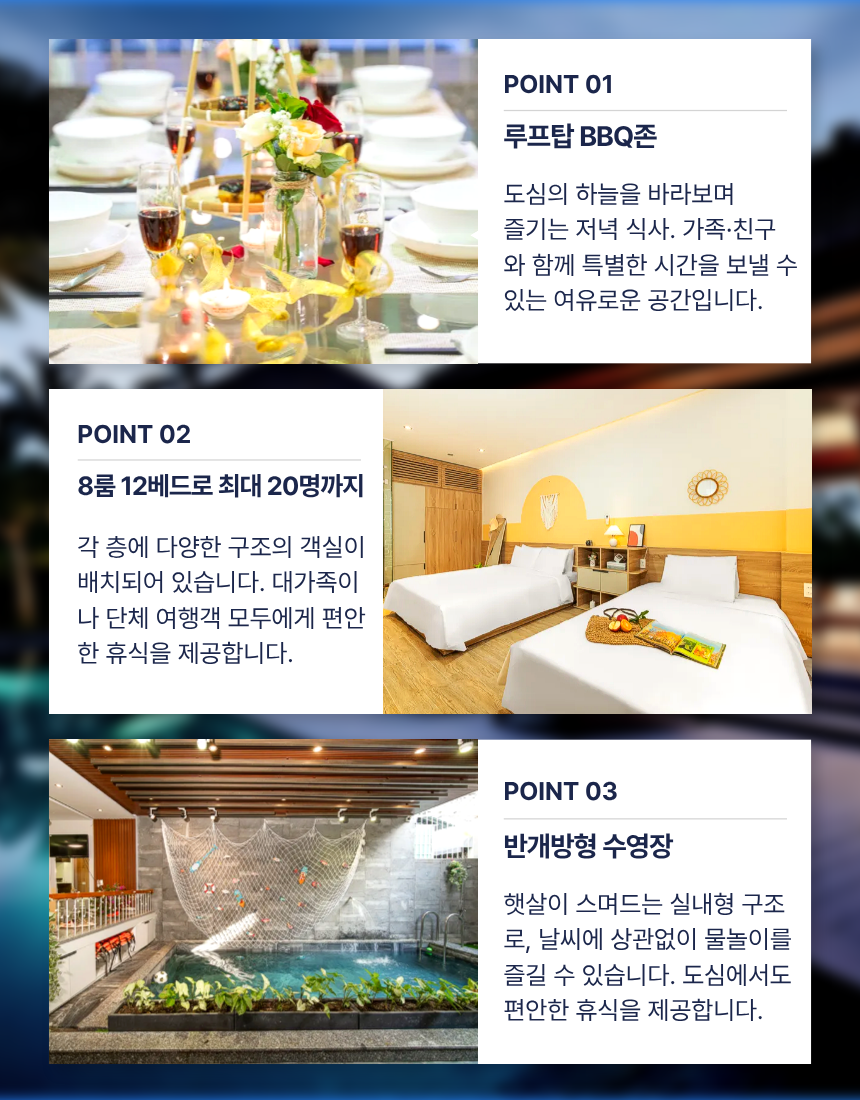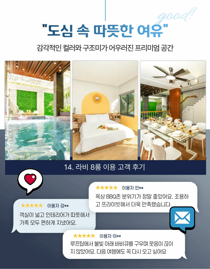 옥상 루프탑 BBQ존은 도심 전망과 함께 식사·파티를 즐기기 좋은 공간입니다. 세탁기·기본 주방 설비가 완비돼 장기 숙박에 적합하며, 거실·주방이 1층 중심에 배치되어 다수 인원의 동선을 효율적으로 관리할 수 있습니다. 미케해변·한시장·한인타운까지 차량 5~10분 거리라 일정 운영이 수월하고, 도심 속에서도 프라이빗한 여유를 원하는 여행객에게 잘 맞는 구조입니다.