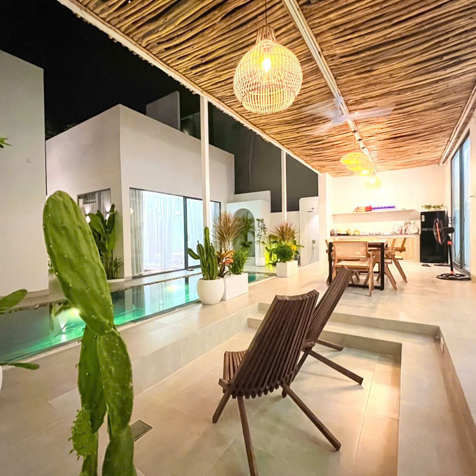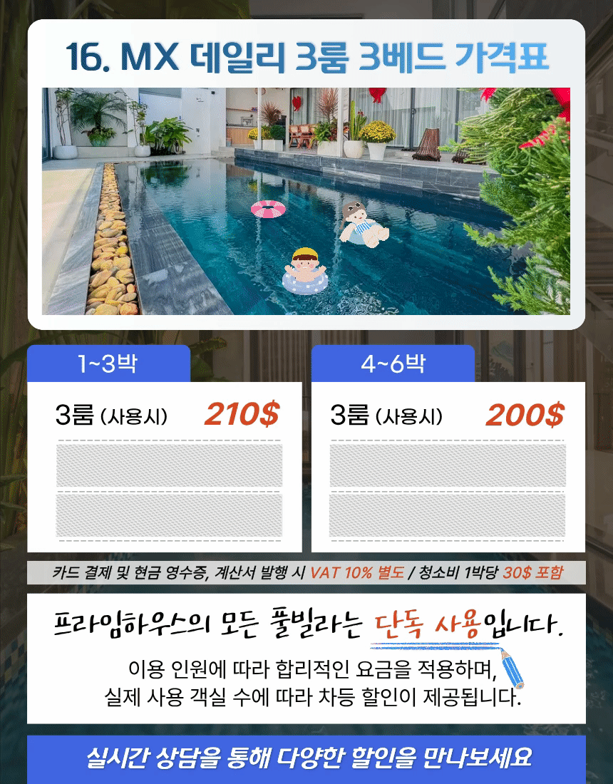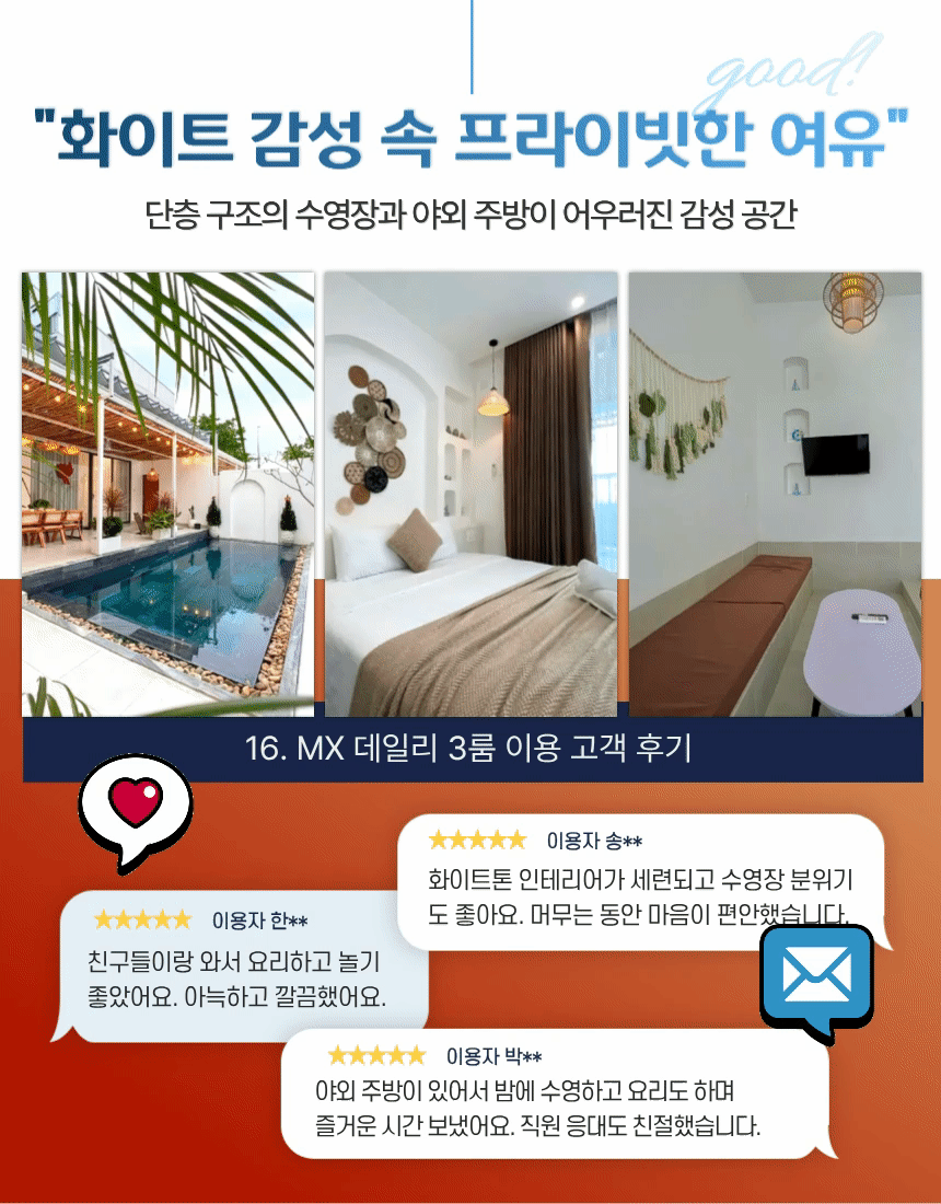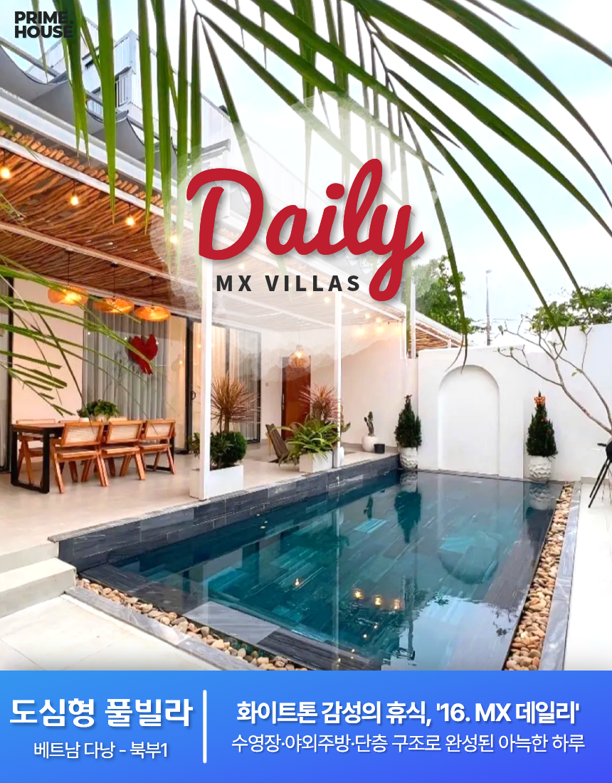 ‘16. MX 데일리’는 3룸 · 3베드 · 4욕실로 구성된 단층형 스탠다드 풀빌라로, 실외 수영장과 거실·야외 주방이 자연스럽게 연결되는 구조가 특징입니다. 수영장(4.8m × 3.6m × 1.5m)은 하루 종일 햇빛이 잘 들어 밝고 아늑한 분위기를 제공하며, 단층 구조라 이동이 편해 아이·어르신이 있는 가족 여행에도 안정적으로 이용할 수 있습니다. 실내는 화이트톤 인테리어와 따뜻한 조명이 어우러져 편안한 분위기를 유지하고, 각 객실에 개별 욕실이 마련돼 소규모 여행에서도 프라이버시가 잘 지켜집니다.
