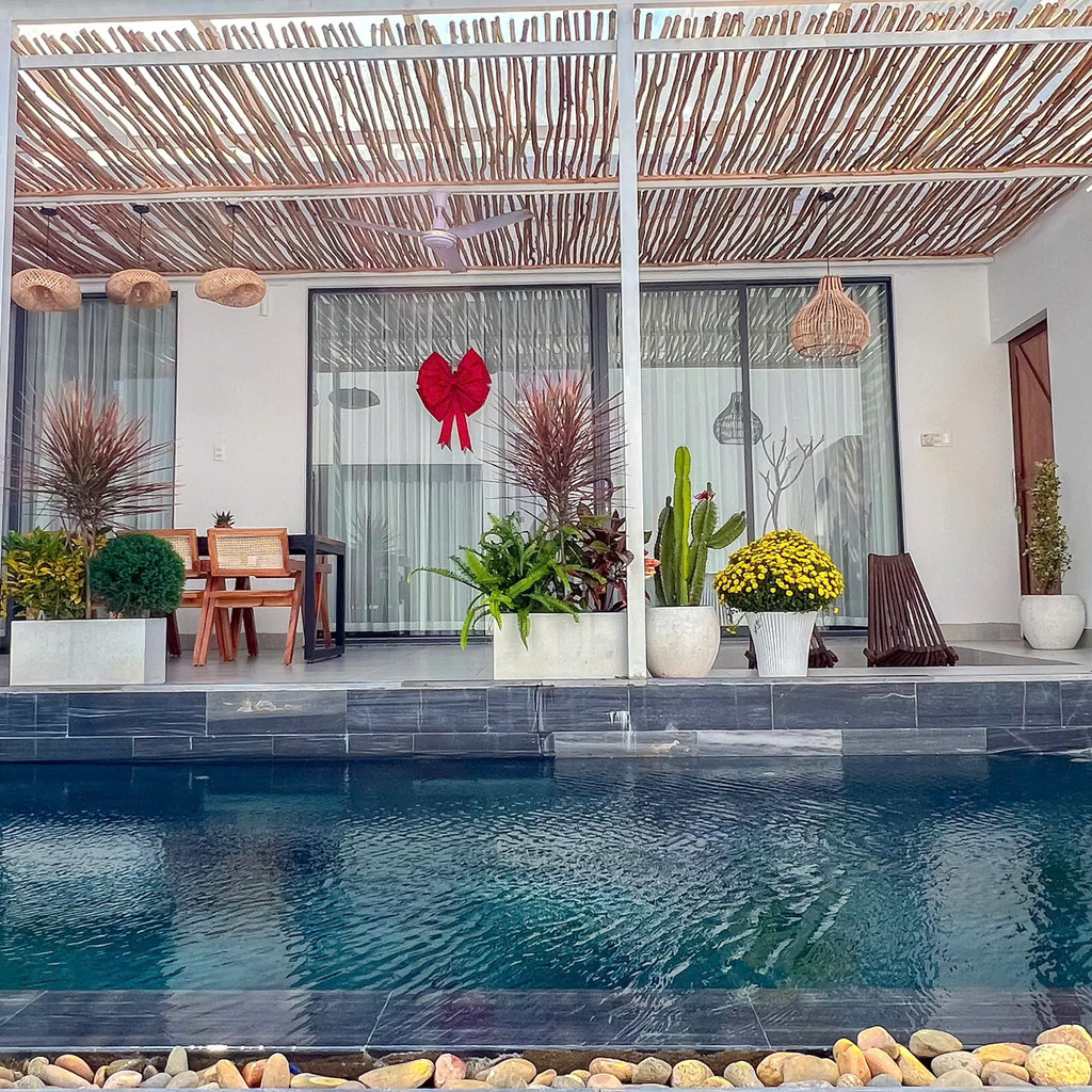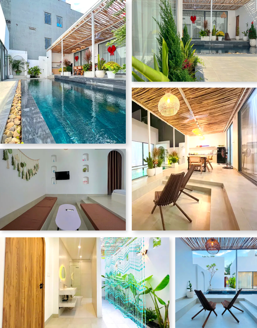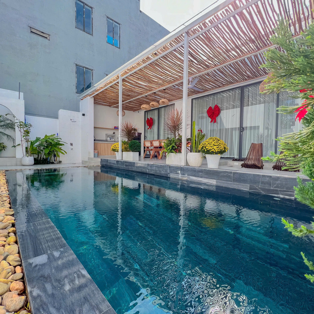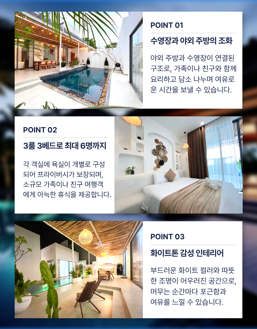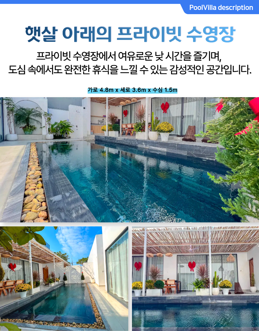 세탁기·주방 설비 등 장기 숙박에 필요한 기본 기능이 완비되어 있어 2~4박 일정에도 불편함이 없습니다. 미케해변·선짜야시장·한시장까지 차량 5~10분 거리라 이동이 수월하고, 도심·해변·로컬거리를 모두 가까이 즐길 수 있습니다. 소규모 가족·친구 여행에서 ‘편안함·안정감·프라이버시’를 원하는 고객에게 적합한 구조를 갖춘 풀빌라입니다.