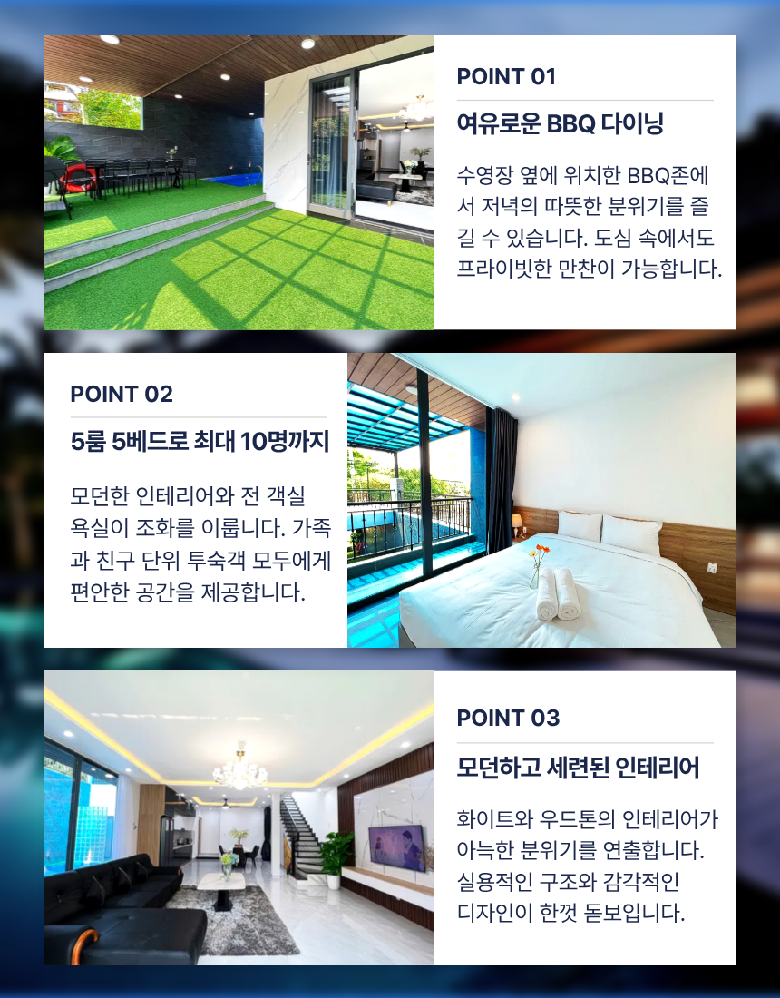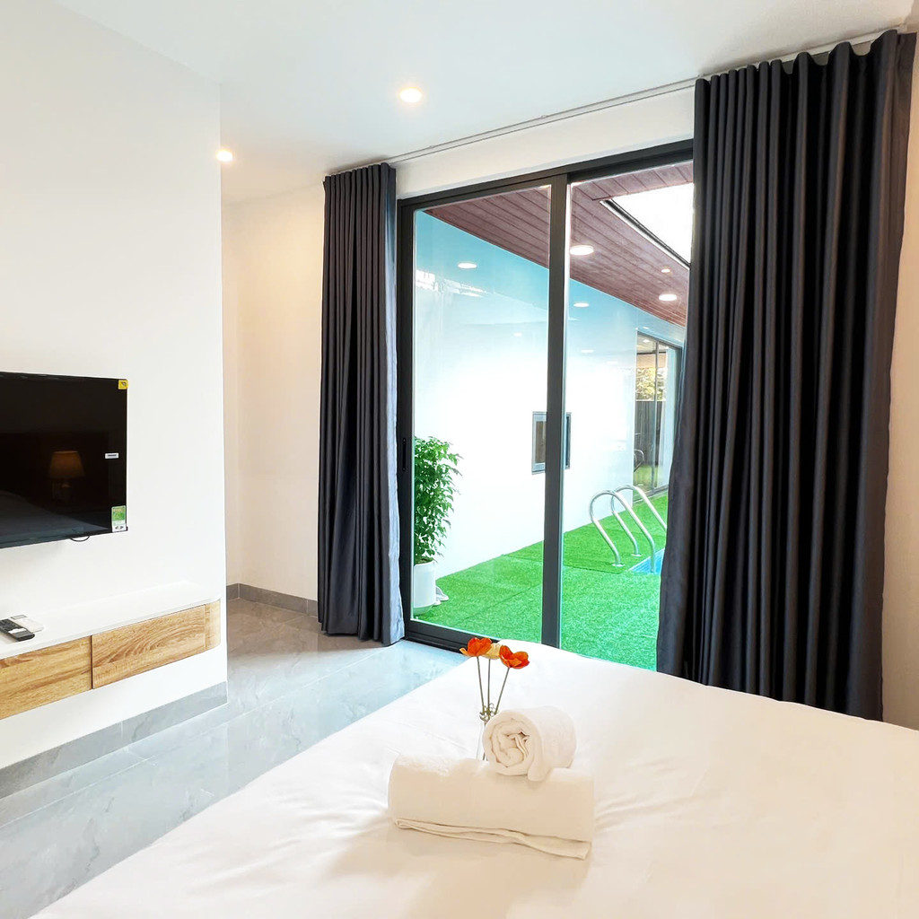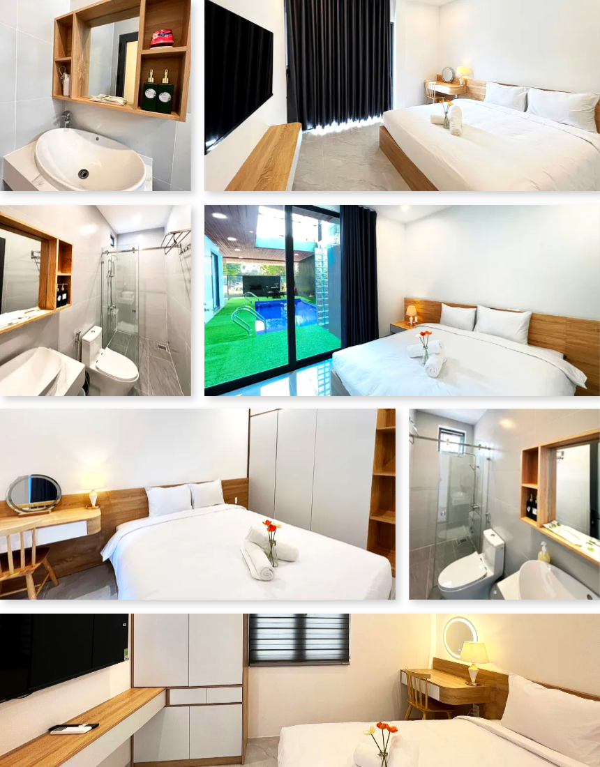 실내는 모던한 감성 위에 따뜻한 우드톤이 더해져 안정된 분위기를 만들고, 전체 객실에 개별 욕실이 마련돼 있어 친구·가족 단위 여행에서도 프라이버시가 확실히 지켜집니다. 세탁기·건조기·주방 설비까지 완비되어 장기 숙박에도 불편함이 없으며, 발코니가 있는 객실에서는 조용한 휴식과 도심 전망을 즐길 수 있습니다. 미케해변·선짜야시장·한시장·한인타운까지 차량 약 5~10분 거리라 이동이 편리해 도심 여행 동선도 효율적입니다. 가족·친구와 함께 프라이빗하고 균형 잡힌 휴식을 원할 때 만족도가 높은 풀빌라입니다. 🌿🌊