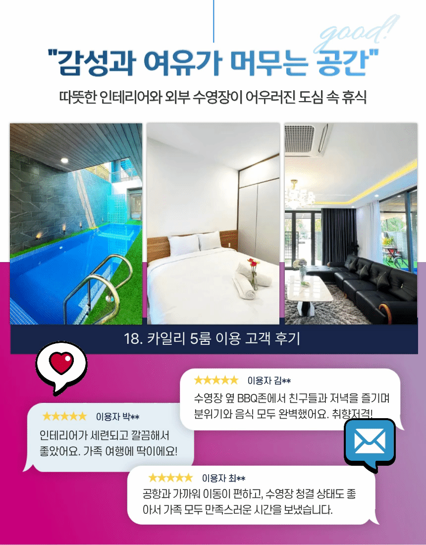 세탁기·건조기·기본 주방 설비 등 장기 숙박 필수 요소가 모두 갖춰진 실용형 풀빌라입니다. 1층 거실·주방 중심 구조는 단체가 머물기 편하며, 미케해변·선짜야시장·한시장까지 차량 5~10분 거리라 일정 이동이 수월합니다. 도심 속에서도 프라이빗하고 안정적인 휴식을 원하는 여행객에게 적합합니다.