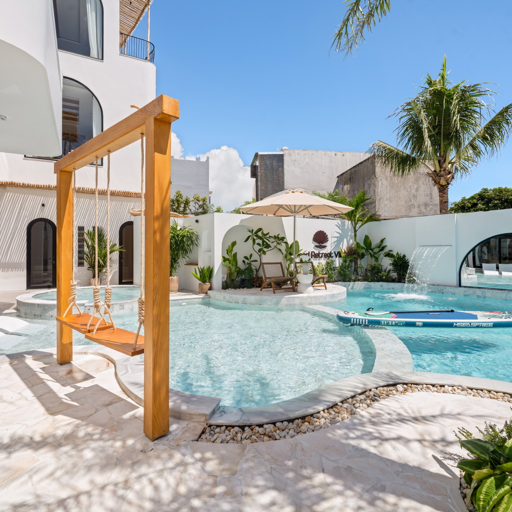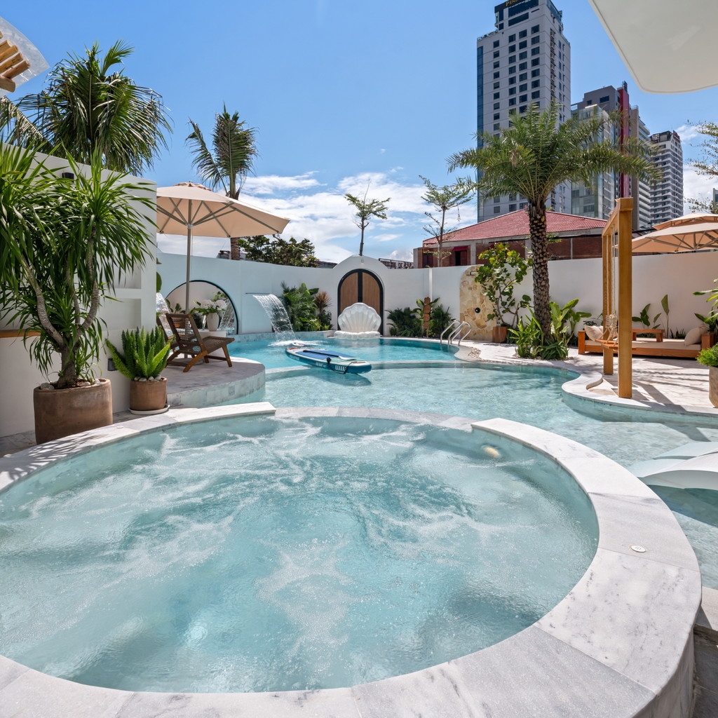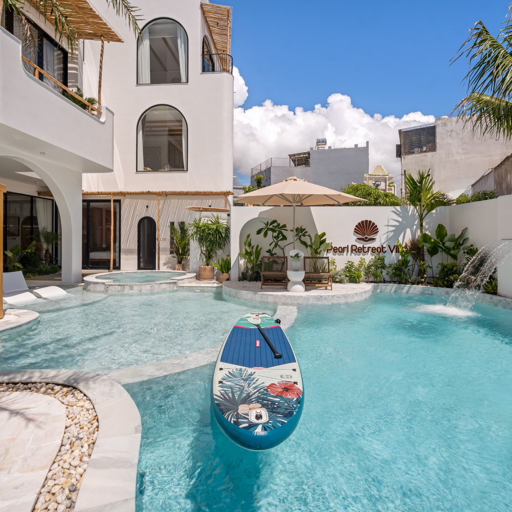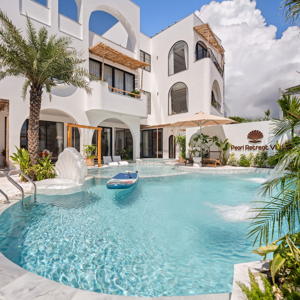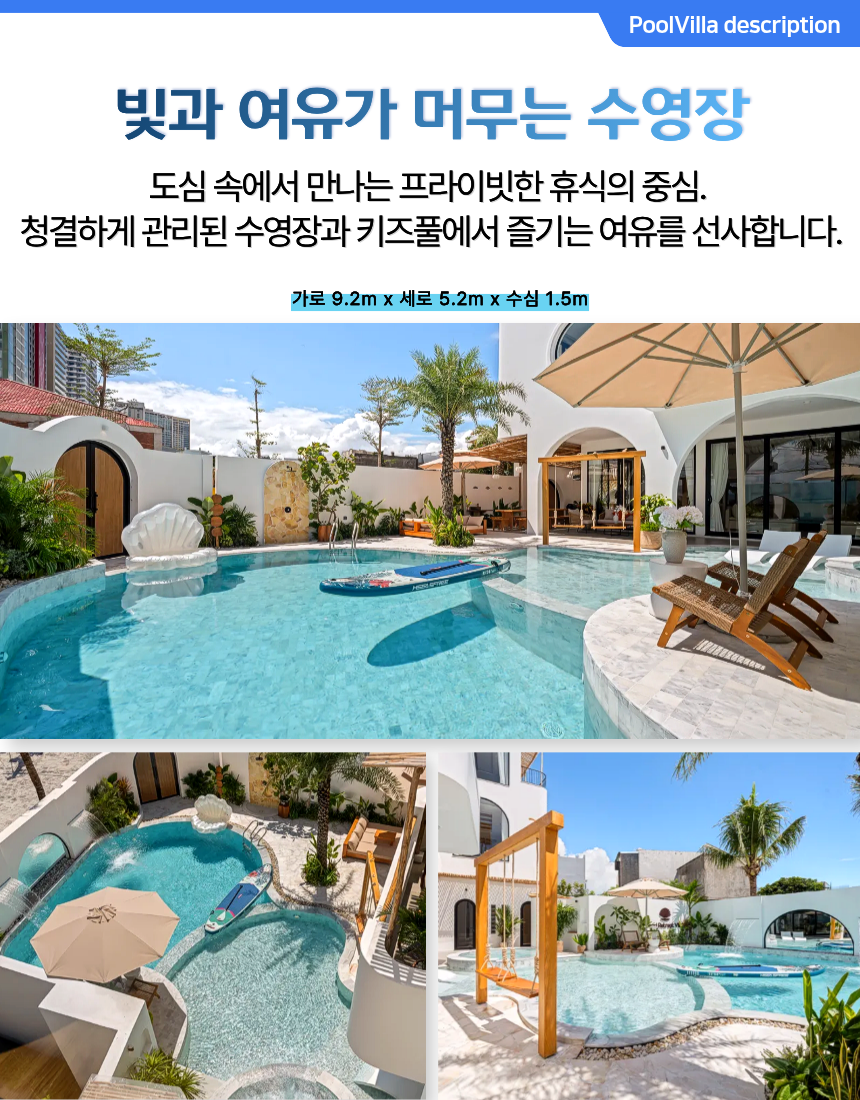 ‘33. 펄’은 10룸 · 11베드 · 11욕실로 구성된 대규모 슈퍼 프리미엄 풀빌라로, 가족·친지·워크숍 등 다인원 여행객에게 최적화된 구조를 갖추고 있습니다. 1층에는 가로 9.2m × 세로 5.2m × 수심 1.5m 규모의 대형 수영장과 키즈풀이 함께 마련돼 있어 아이와 어른 모두가 편안하게 물놀이를 즐길 수 있습니다. 자쿠지·사우나·포켓볼·피클볼 코트·BBQ존까지 다양한 시설이 한 공간에 구성돼 숙소 안에서만으로도 충분히 여가를 즐길 수 있는 점이 강점입니다.
