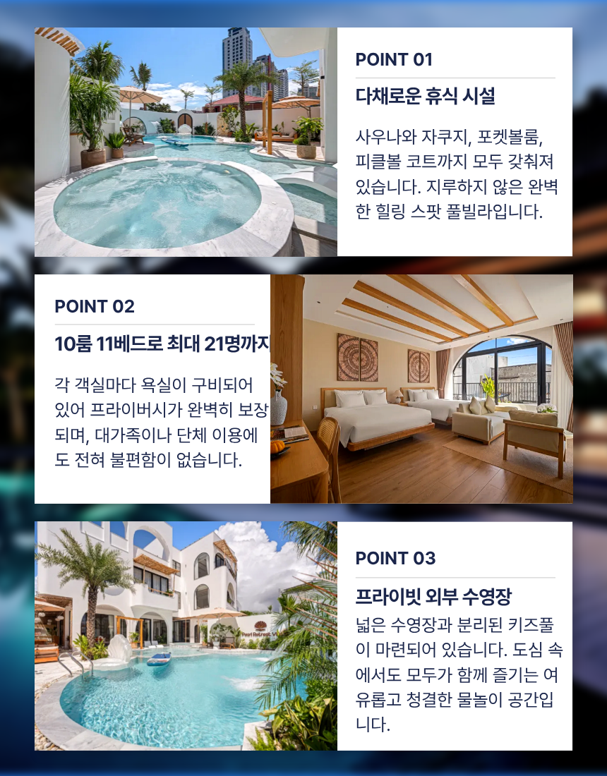 | 공항 픽업 / 샌딩 서비스 | 다낭 공항 → 풀빌라 간 전용 차량 이동 | 유튜브 구독 & 네이버 카페 회원 전용 |