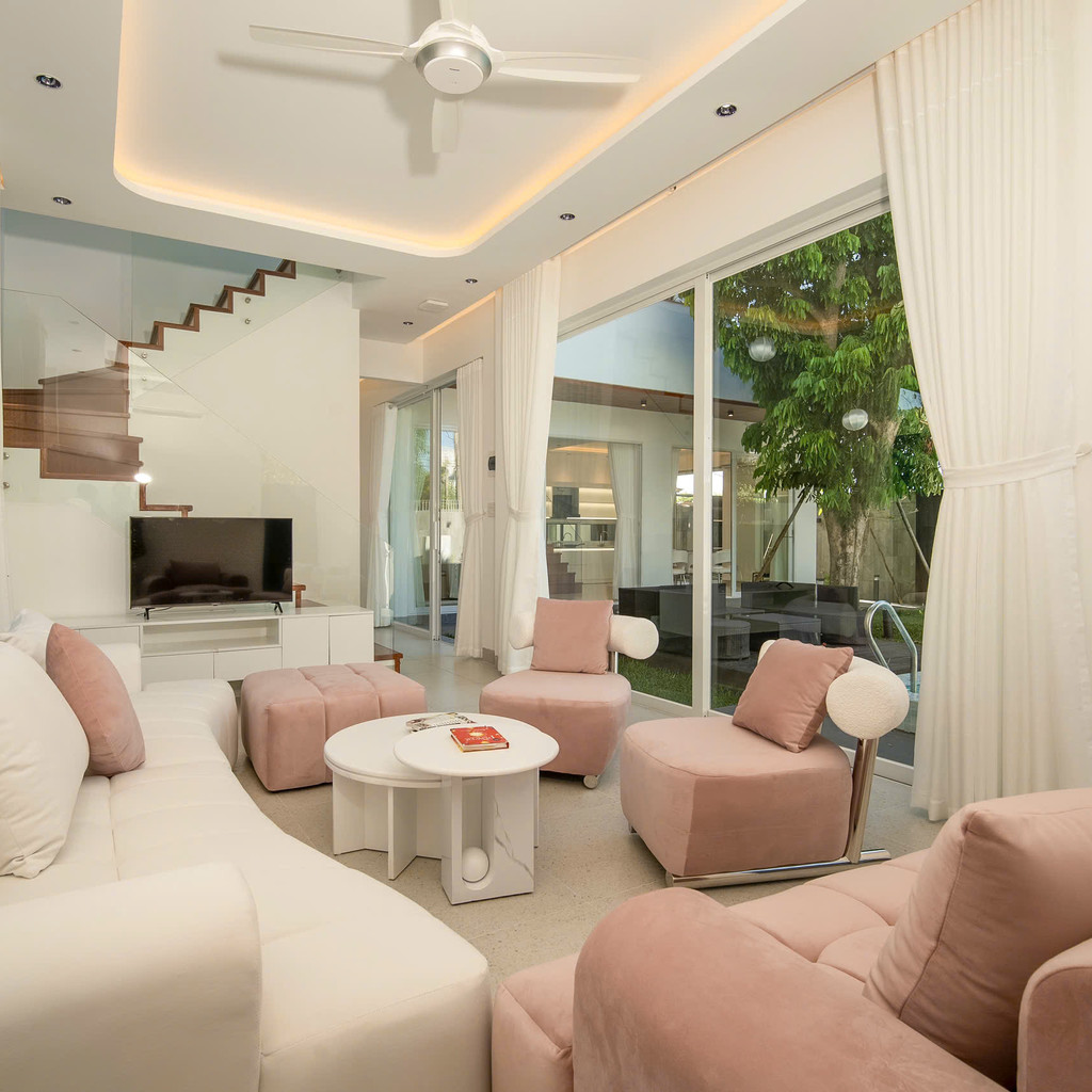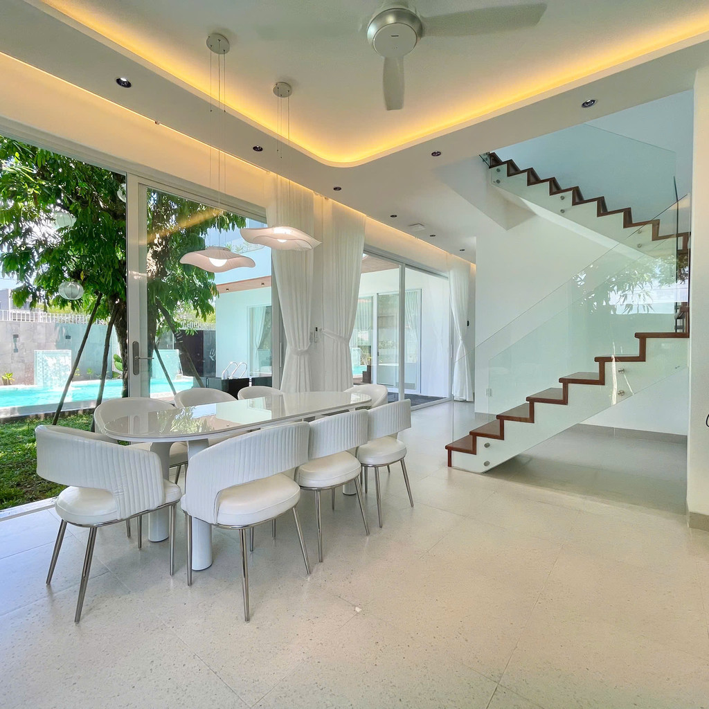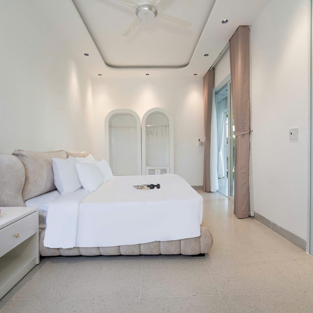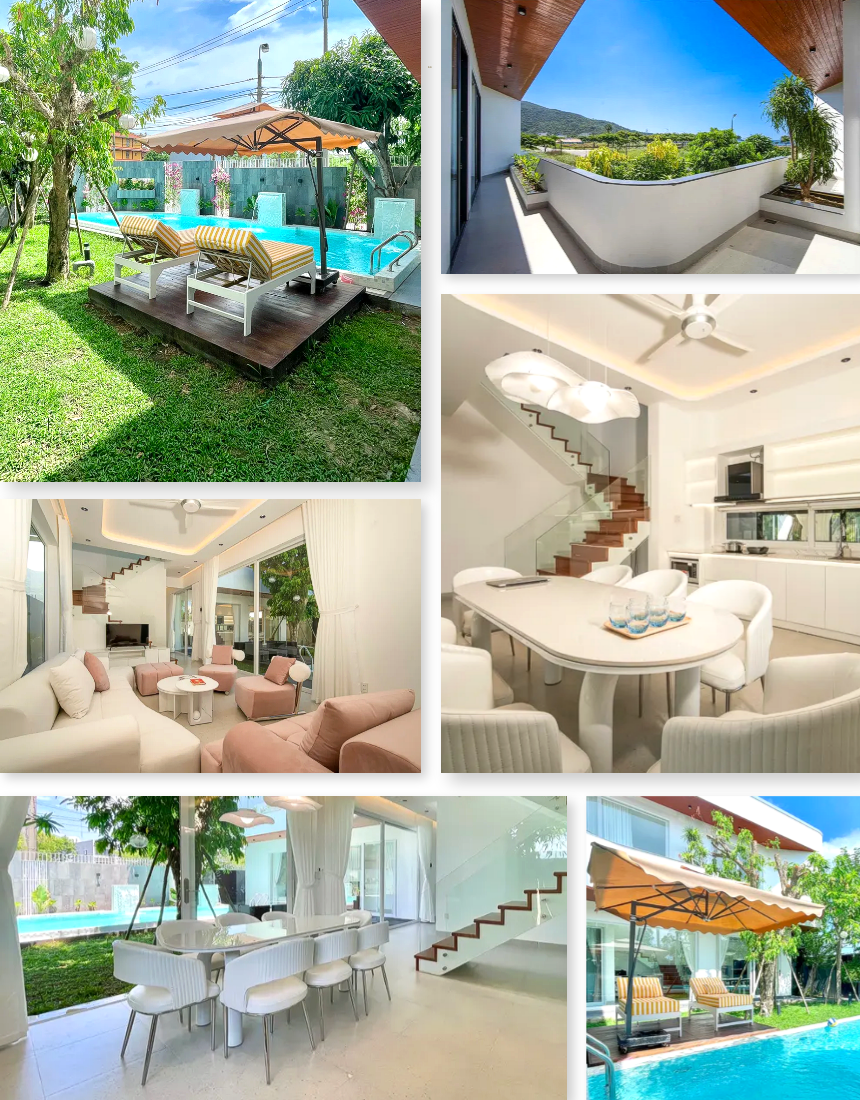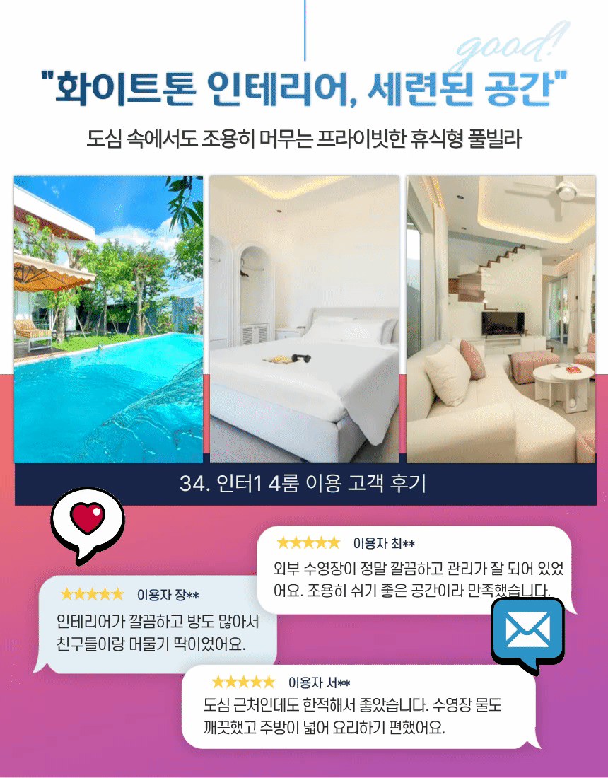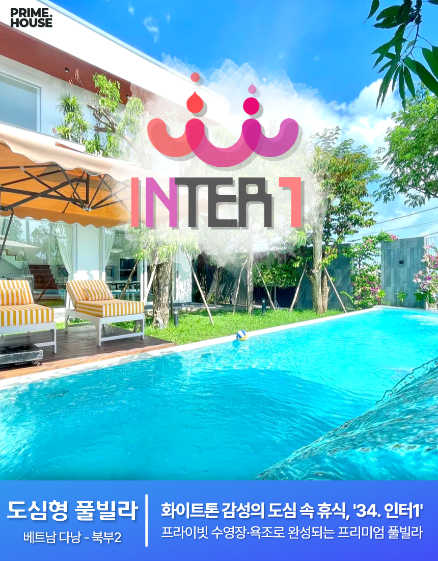 ‘34. 인터1’은 4룸 · 4베드 · 5욕실로 구성된 도심형 스탠다드 풀빌라로, 화이트톤과 우드톤이 어우러진 차분한 인테리어가 특징입니다. 1층에는 가로 7.2m × 세로 3.6m × 수심 1.5m의 실외 수영장이 자리해 햇살이 잘 들어오며, 수영장과 거실·주방이 자연스럽게 이어져 머무는 동안 생활 동선이 단순하고 편리합니다. 1층 원베드룸과 실내 욕조는 아이·어르신 동반 여행에도 안정적으로 사용할 수 있는 구조입니다.