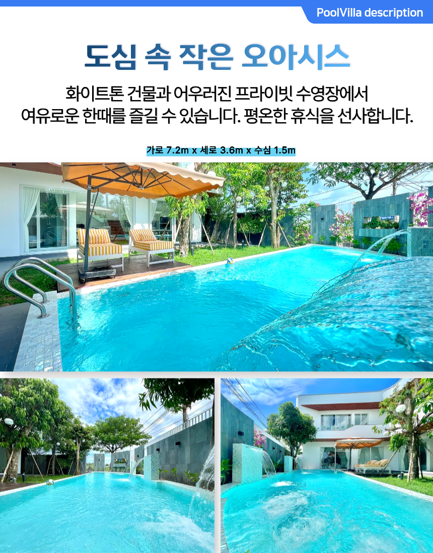세탁기, 건조기, 주방, 기본 생활 가전이 모두 갖춰져 있어 2~3박 이상의 일정에도 부담이 적고, 직접 요리를 하며 머무는 여행 스타일에도 잘 맞습니다. 미케해변·한인타운·카페 거리까지 차량 5~10분 정도면 도착할 수 있어 일정 구성도 수월합니다. 과한 화려함보다는 깔끔함·실용성을 중시하는 여행객에게 어울리는 도심형 풀빌라입니다.