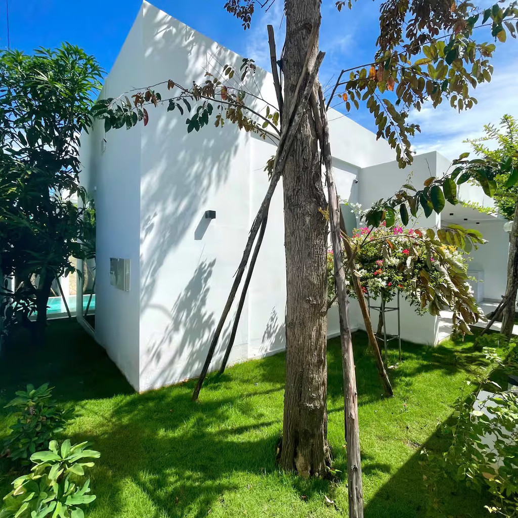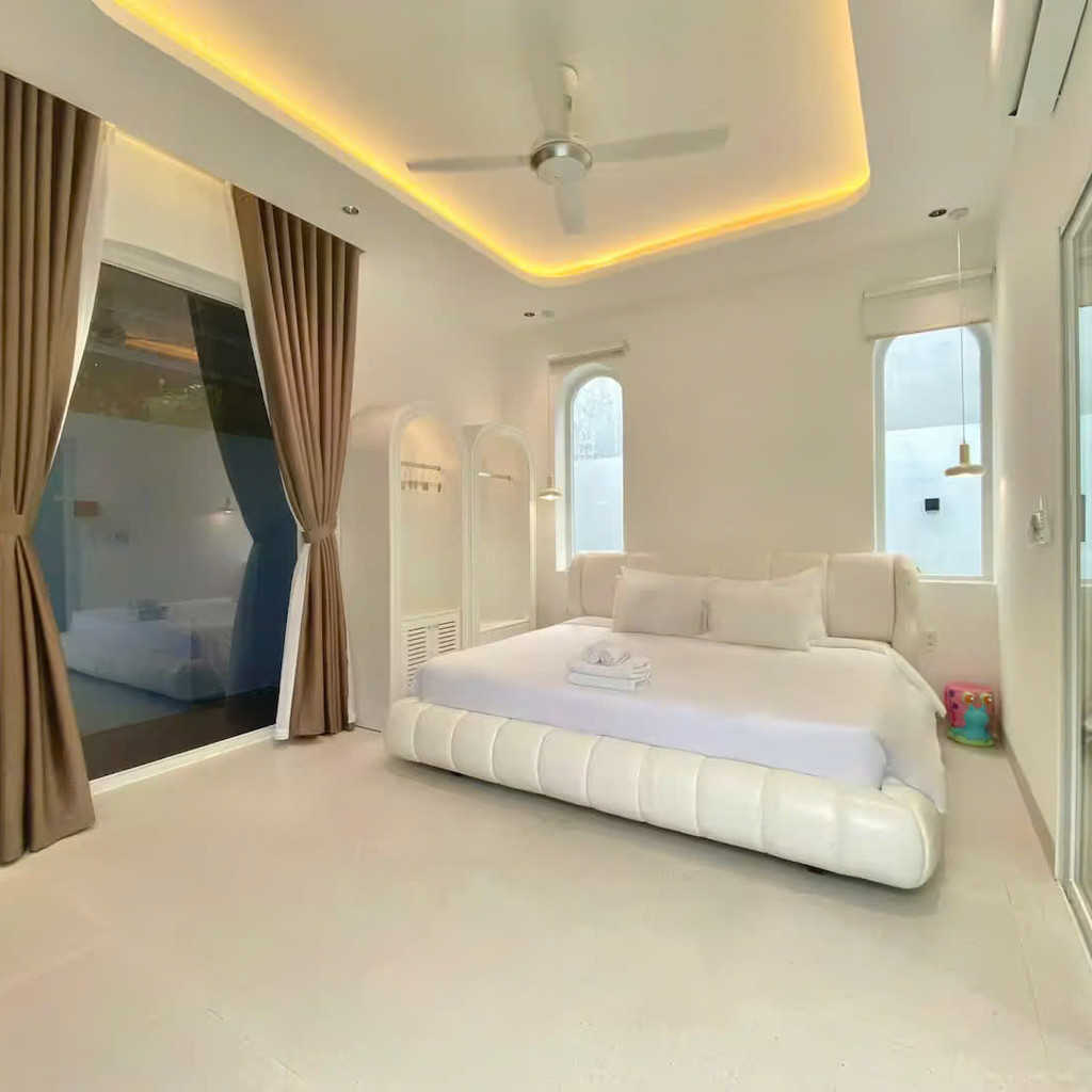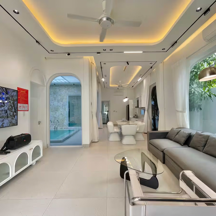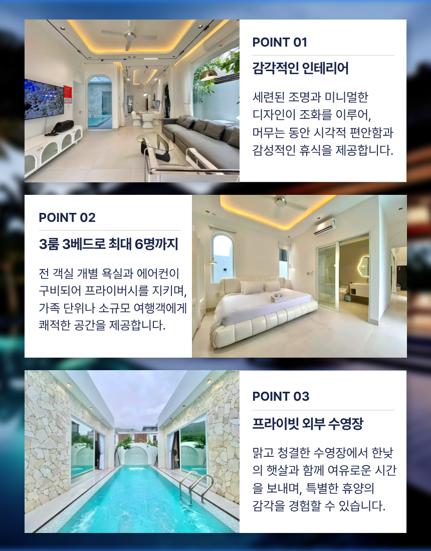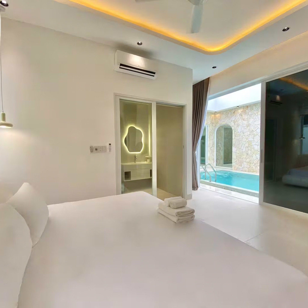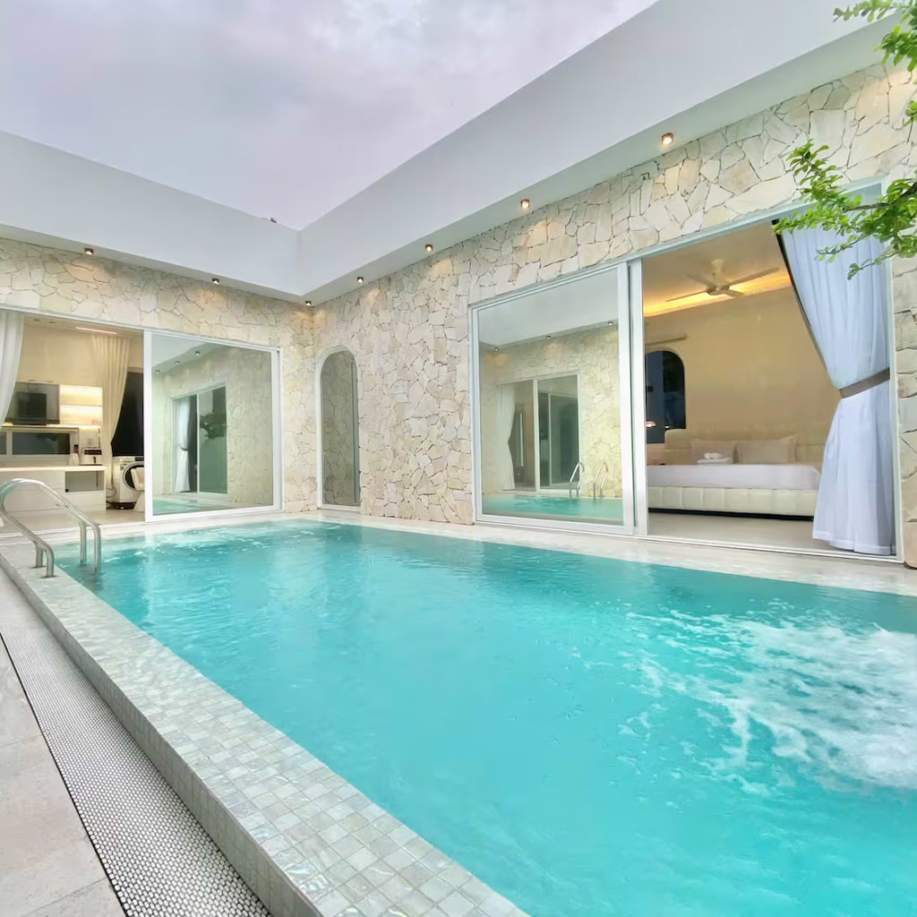 ‘36. 미카’는 화이트톤 인테리어와 단층 구조가 결합된 도심형 스탠다드 풀빌라로, 3룸·3베드·4욕실 구성으로 소규모 가족·연인·친구 여행에 적합한 형태입니다. 거실·주방·수영장이 일렬로 연결된 배치는 이동이 단순하고, 실외 수영장(4.6m × 3.2m × 1.5m)은 채광이 좋아 하루 동안 밝은 분위기를 유지합니다. 실내 욕조와 세탁기가 마련돼 있어 장기·단기 일정 모두 편안하게 머무를 수 있으며, 전체가 1층에 배치되어 있어 아이·어르신과의 여행에서도 동선 부담이 적습니다.