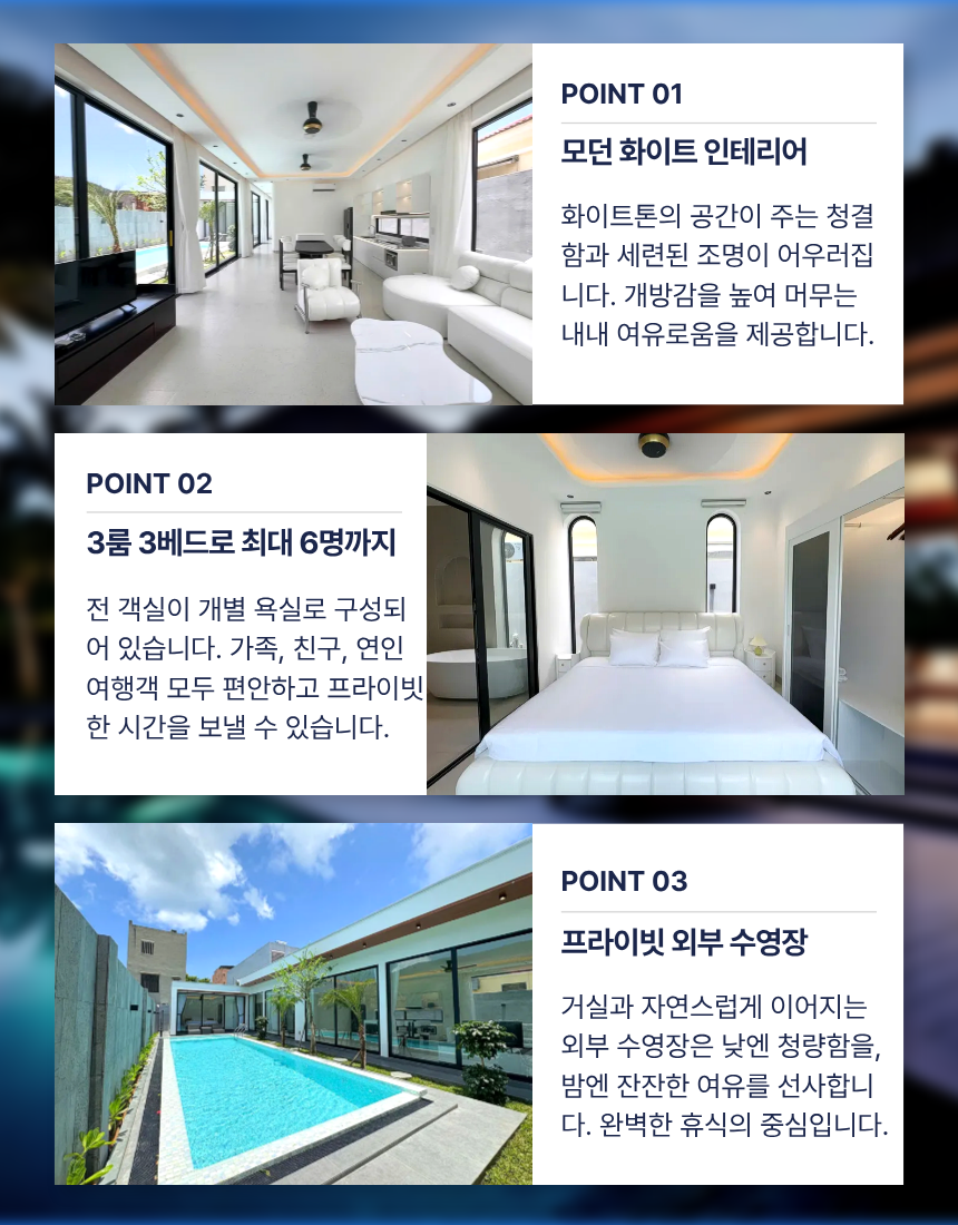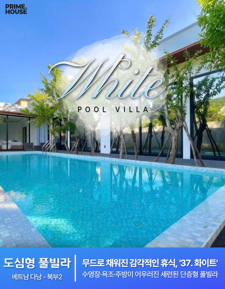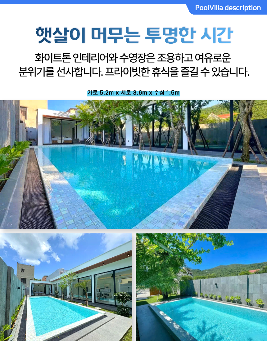 ‘37. 화이트’는 화이트톤 인테리어와 통유리 디자인이 조화를 이루는 도심형 스탠다드 풀빌라로, 3룸·3베드·4욕실 구성의 단층 구조를 갖추고 있습니다. 거실·주방·수영장이 자연스럽게 연결된 배치는 이동이 단순하고 체류 중 물놀이·휴식·식사 동선을 편안하게 이어줍니다. 실외 수영장(5.2m × 3.6m × 1.5m)은 채광이 안정적으로 확보되는 앞마당형 구조라 밝은 분위기를 유지하며, 실내 욕조와 세탁기 등 생활 편의 설비도 기본적으로 갖춰져 있습니다.