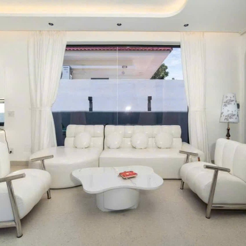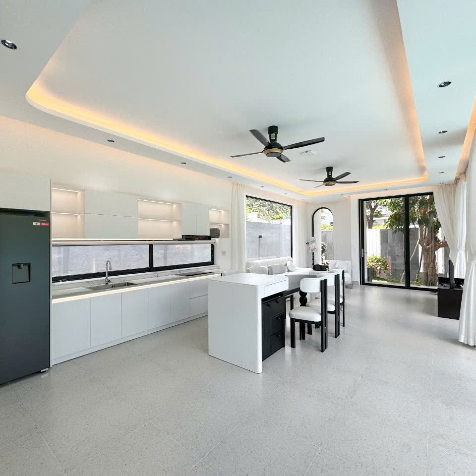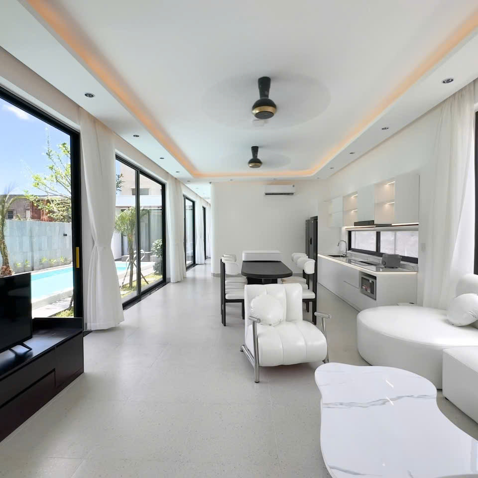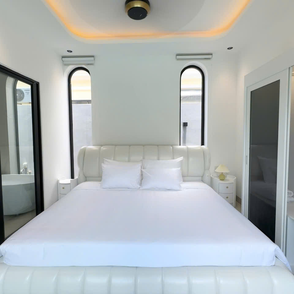 ‘37. 화이트’는 화이트톤 인테리어와 통유리 디자인이 조화를 이루는 도심형 스탠다드 풀빌라로, 3룸·3베드·4욕실 구성의 단층 구조를 갖추고 있습니다. 거실·주방·수영장이 자연스럽게 연결된 배치는 이동이 단순하고 체류 중 물놀이·휴식·식사 동선을 편안하게 이어줍니다. 실외 수영장(5.2m × 3.6m × 1.5m)은 채광이 안정적으로 확보되는 앞마당형 구조라 밝은 분위기를 유지하며, 실내 욕조와 세탁기 등 생활 편의 설비도 기본적으로 갖춰져 있습니다.