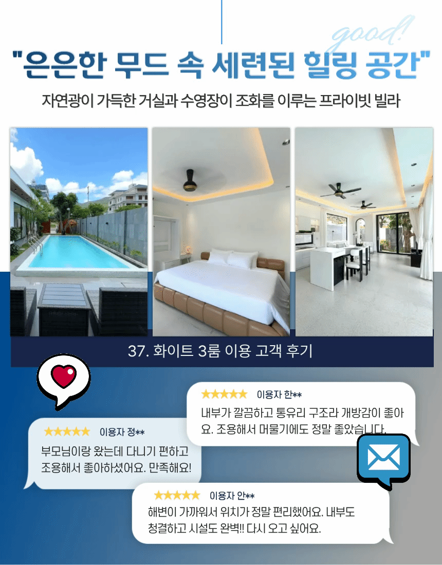 세탁기와 기본 주방 설비가 준비되어 있어 장기 숙박에서도 생활 리듬을 무리 없이 유지할 수 있습니다. 미케해변·먼타이해변까지 차량 약 5분, 주요 상권과 관광지까지도 10~20분 내 접근할 수 있어 이동 효율이 높습니다. 화려함보다는 실용성과 깔끔한 공간 구성에 가치를 두는 여행객에게 잘 맞는 도심형 풀빌라입니다.
