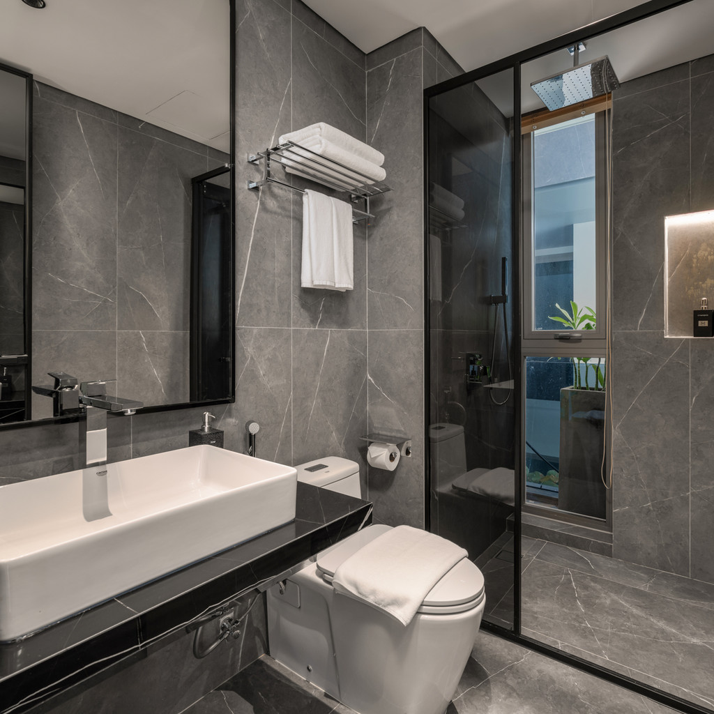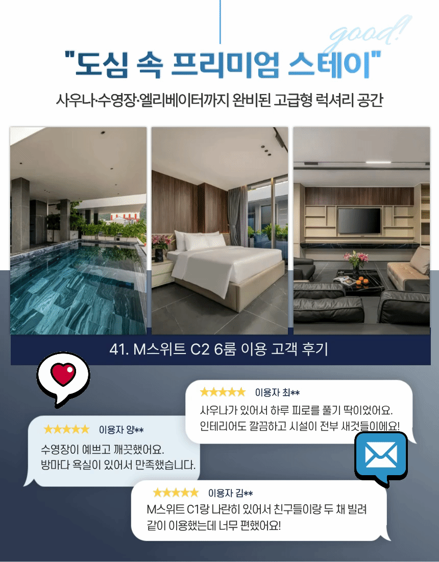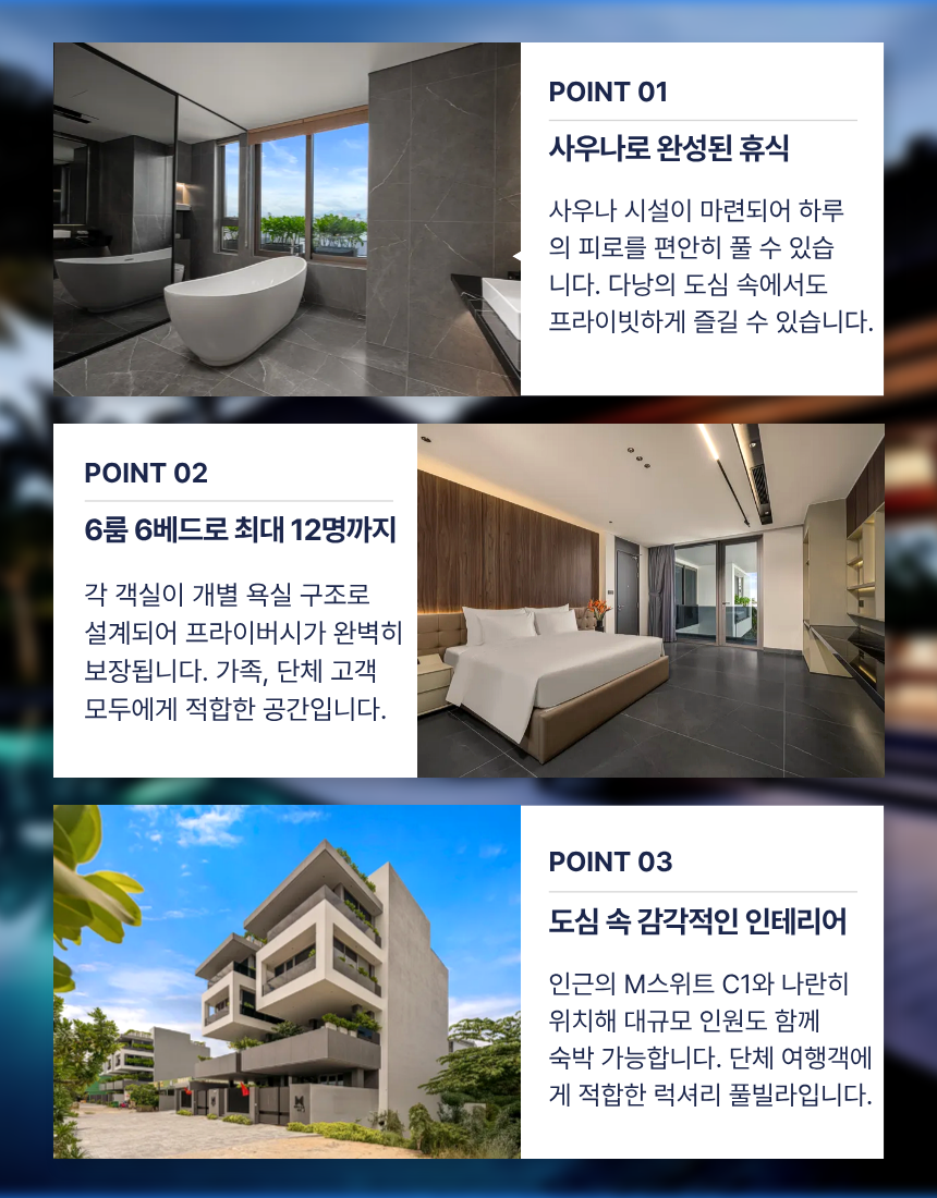 객실은 3·4층에 층별로 나뉘어 있어 인원이 많은 일정에서도 생활 패턴이 충돌하지 않으며, 모든 객실이 내부 욕실을 갖춘 구조라 프라이버시가 명확히 유지됩니다. 일부 객실은 욕조를 포함해 장거리 이동 후 회복에도 적합하며, 옥상 테라스에서는 주변 시내와 해변 방향 뷰를 함께 즐길 수 있습니다. 미케해변·한인타운까지 차량 약 5~10분 거리라 이동이 편리하며, 동일 라인의 M스위트 C2와 함께 사용하면 인원이 많은 팀에도 유연하게 대응할 수 있는 구조입니다.🏙️🏊♂️