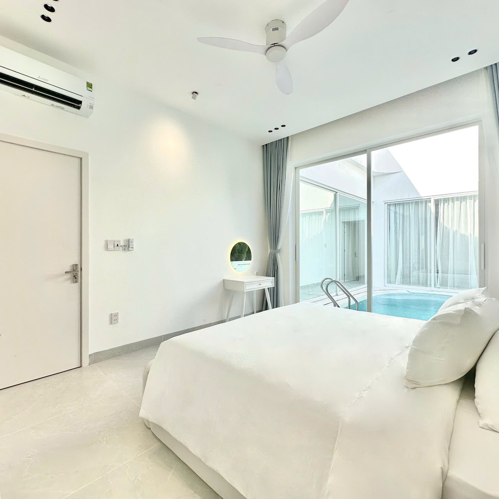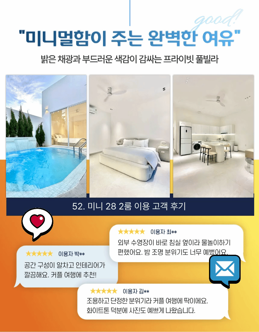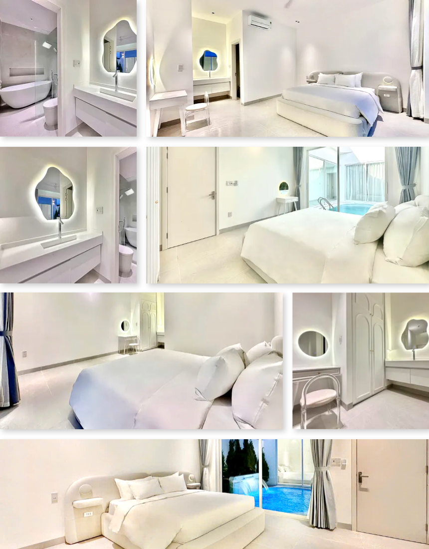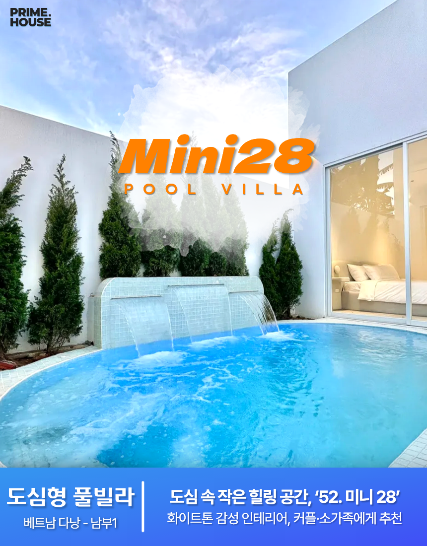 ‘52. 미니 28’은 2룸 · 2베드 · 3욕실로 구성된 1층 단층 구조의 도심형 스탠다드 풀빌라입니다. 화이트톤 인테리어와 컴팩트한 평면이 특징이며, 4.6m × 3.2m × 1.5m 규모의 실외 수영장이 거실·주방과 가깝게 배치되어 있어 작은 규모임에도 활용도가 높습니다. 두 개의 원베드룸은 각각 내부 욕실과 실내 욕조를 갖추고 있어 동행 인원이 각자 프라이빗하게 쉴 수 있는 구조입니다. 세탁기·기본 주방 설비·에어컨 등 필수 설비가 알맞게 갖춰져 있어 짐이 많은 일정에도 사용이 단순합니다.