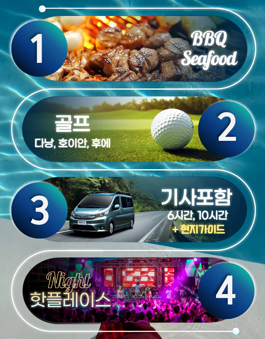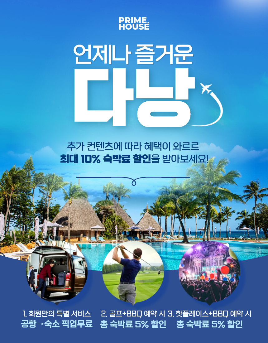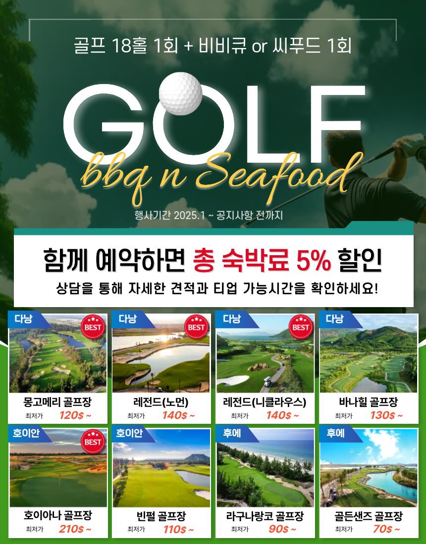 | 골프 패키지 | 몽고메리 · 레전드(노먼/니클) · 바나힐 · 호이아나 · 빈펄 · 라구나 랑코 · 골든샌즈 중 18홀 1회 + BBQ 또는 씨푸드 세트 1회 포함 | 총 숙박료 5% 할인 |