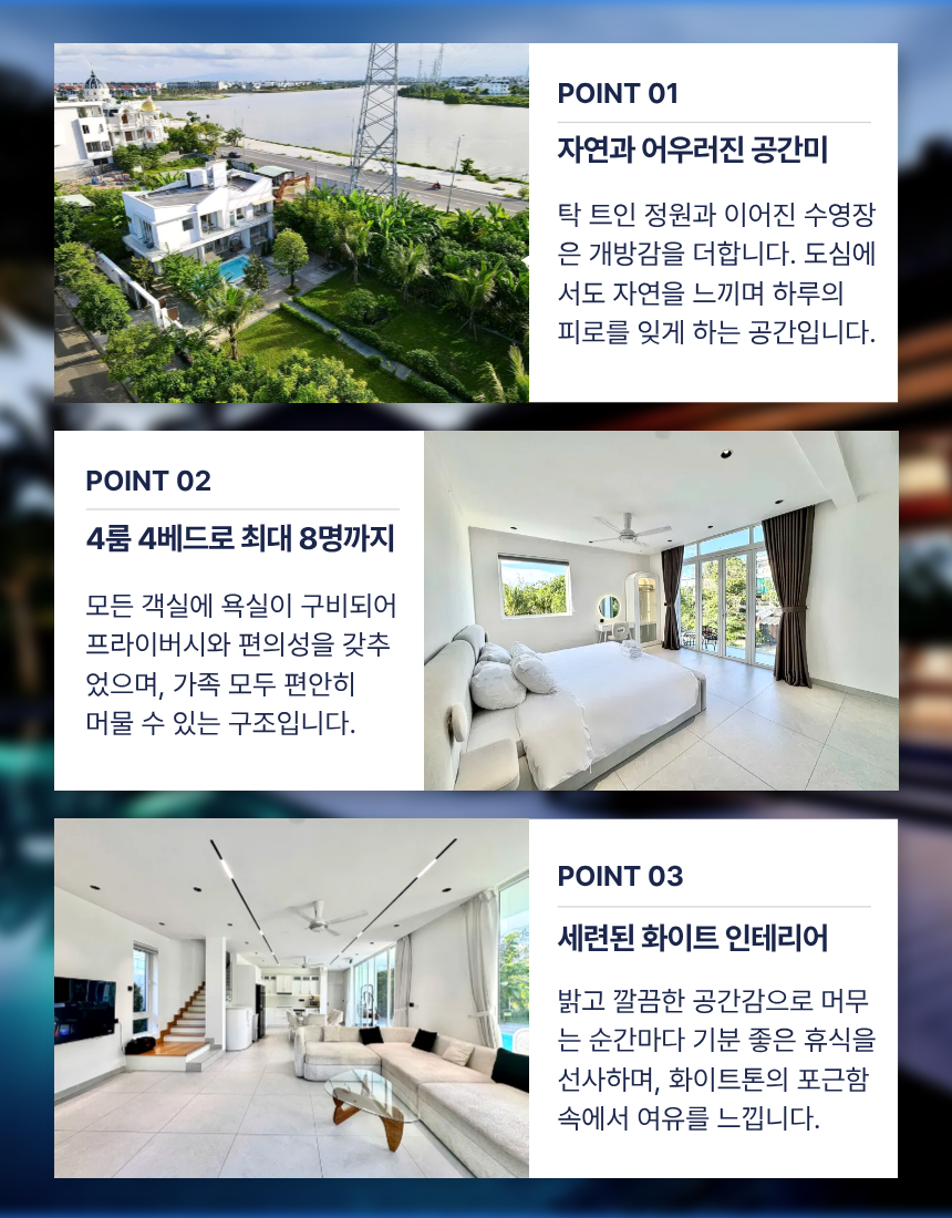 | 공항 픽업 / 샌딩 서비스 | 다낭 공항 → 풀빌라 간 전용 차량 이동 | 유튜브 구독 & 네이버 카페 회원 전용 |