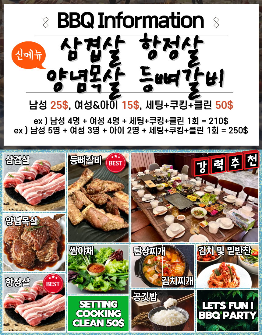 | BBQ 세트 | 삼겹살 · 항정살 · 양념목살 · 등뼈갈비 + 쌈야채 · 된장찌개 · 밑반찬 | 남성 $25 여성·어린이 $15 세팅·쿠킹·클린 1회 $50 |