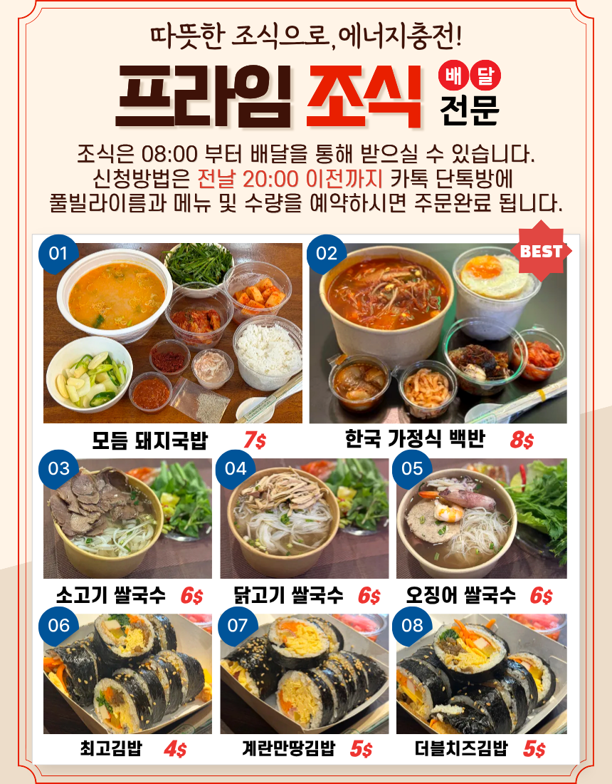 | 조식 안내 | 한국 가정식 백반 ($8) 김밥 세트 ($5) 쌀국수 세트 ($6) | 오전 08:00부터 가능 배달전날 20:00 이전 카톡 단톡방 예약 필수 |