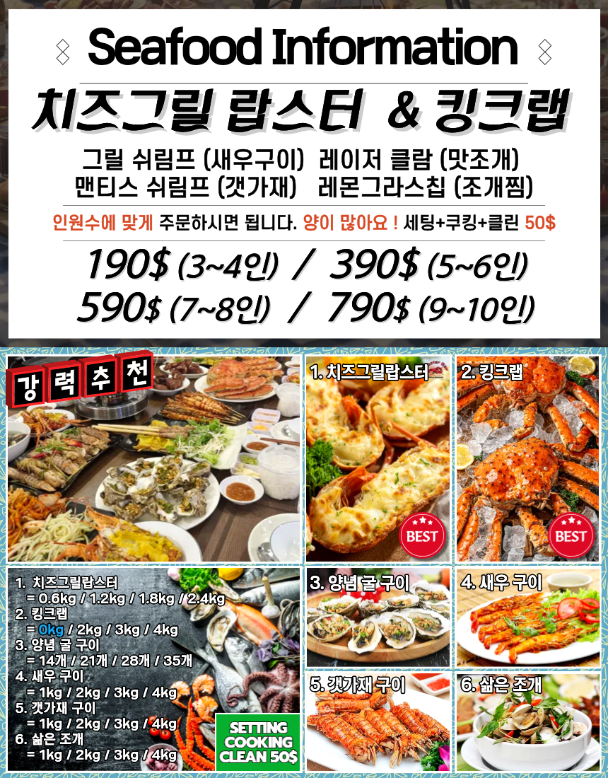 | 씨푸드 세트 | 치즈그릴랍스터 · 킹크랩 · 새우구이 · 전복가재구이 · 양념굴구이 | 3~4인 $190 / 5~6인 $390 / 7~8인 $590 / 9~10인 $790 세팅·쿠킹·클린 1회 $50 |