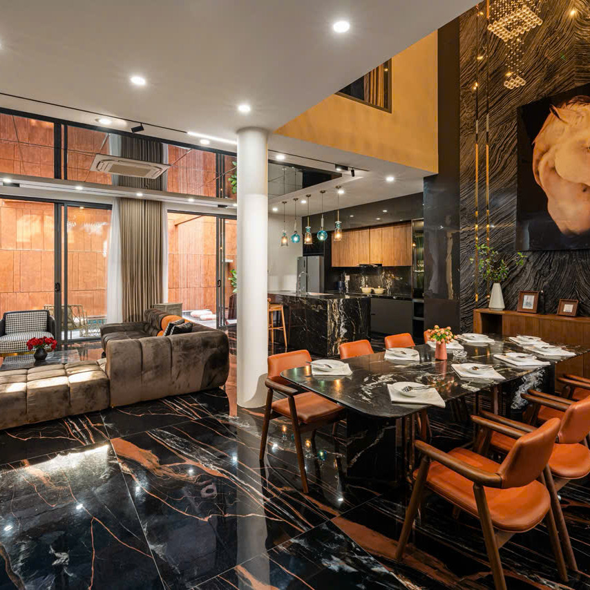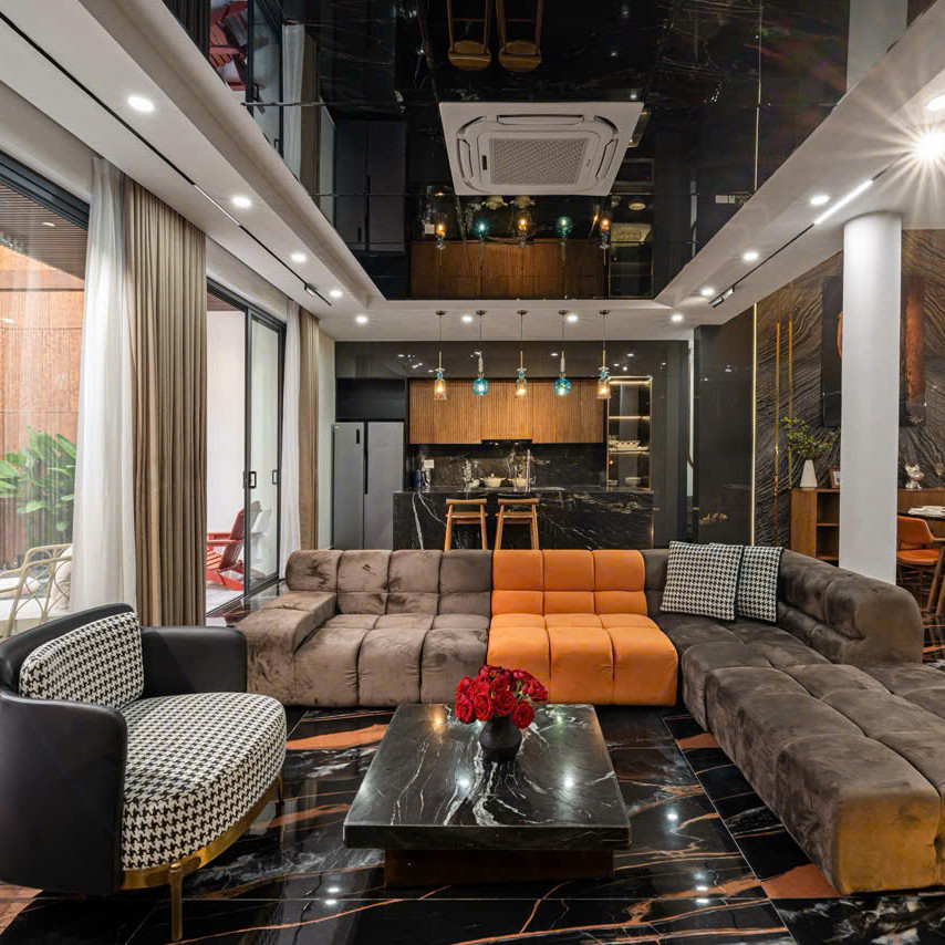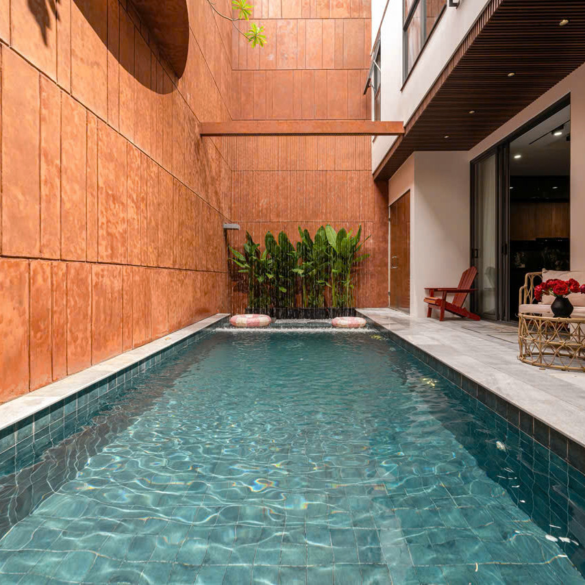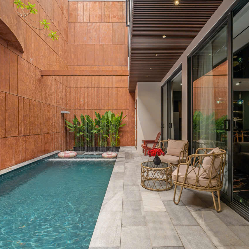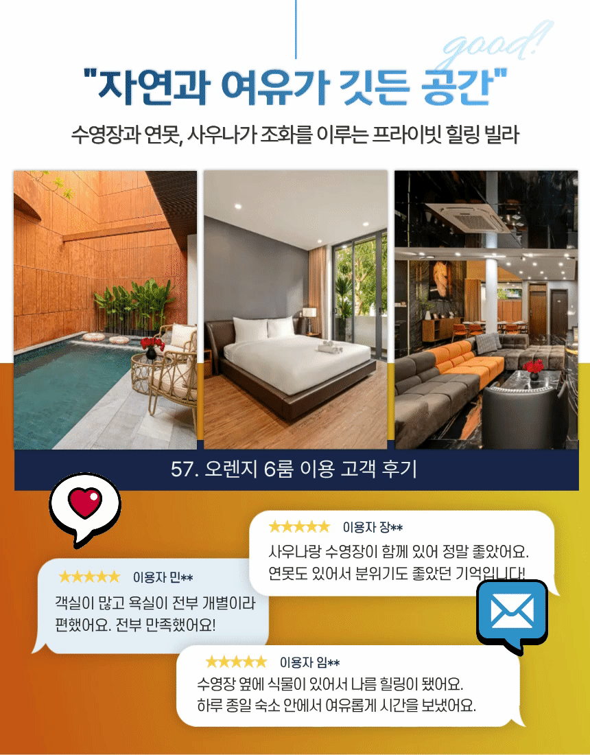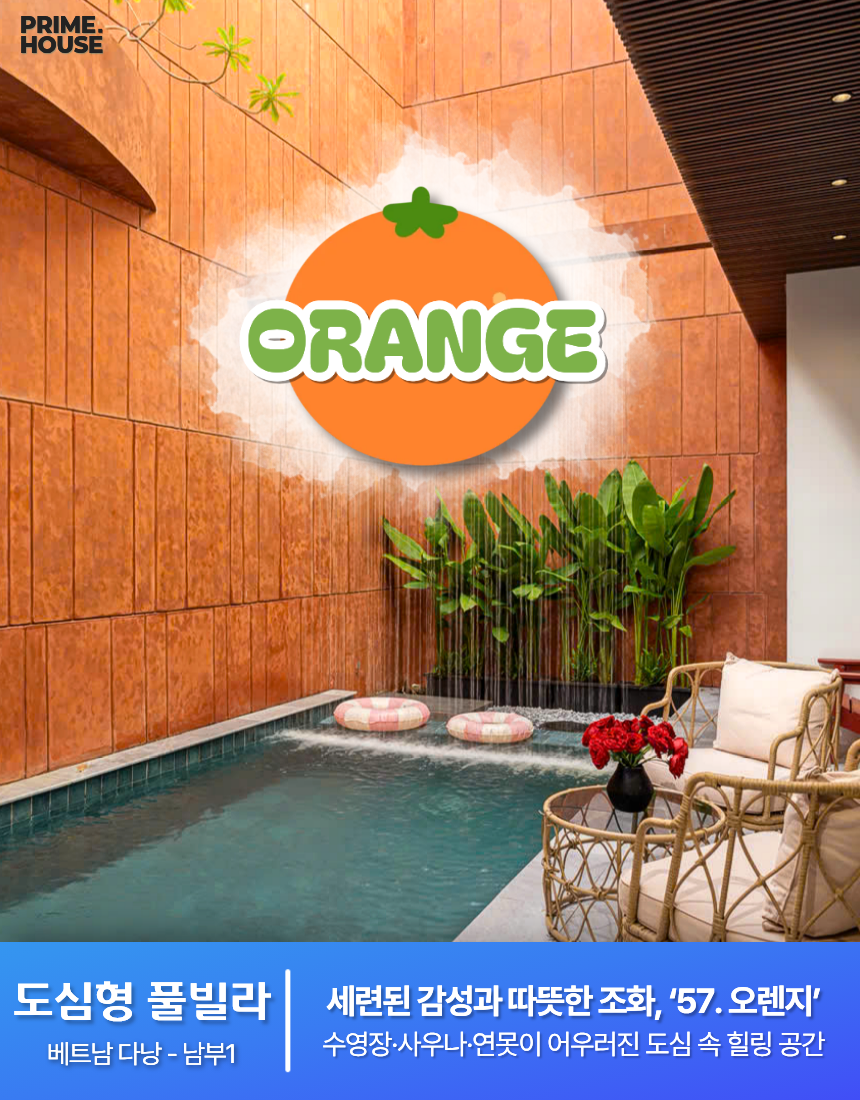 ‘57. 오렌지’는 6룸 · 6베드 · 7욕실로 구성된 3층 규모의 프리미엄 도심형 풀빌라입니다. 1층에는 가로 6.2m × 세로 3.6m × 수심 1.6m의 외부 수영장과 연못이 어우러져 자연적인 여유를 느낄 수 있으며, 거실·주방과 이어진 구조라 물놀이—휴식—식사 동선이 단순합니다. 같은 층에 마련된 사우나는 이동 후 피로를 풀기 좋고, 1층 객실은 접근성이 좋아 가족·지인 단위 일정에 유용합니다. 고급 대리석 포인트와 우드톤 인테리어는 전체 공간에 세련된 분위기를 더해 머무는 동안 편안한 안정감을 제공합니다.🌤️