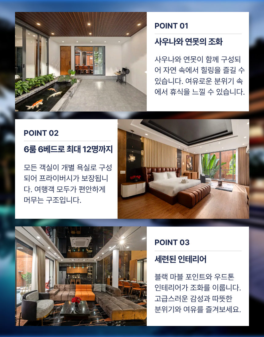 | 공항 픽업 / 샌딩 서비스 | 다낭 공항 → 풀빌라 간 전용 차량 이동 | 유튜브 구독 & 네이버 카페 회원 전용 |