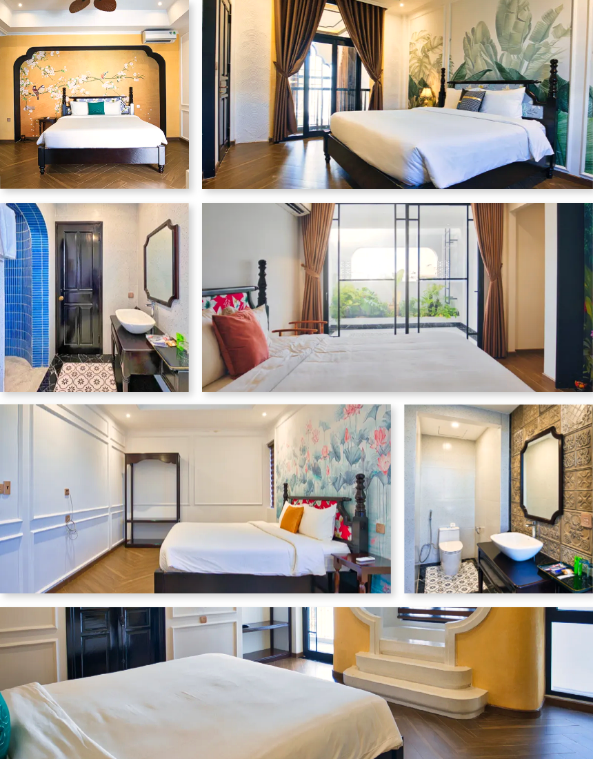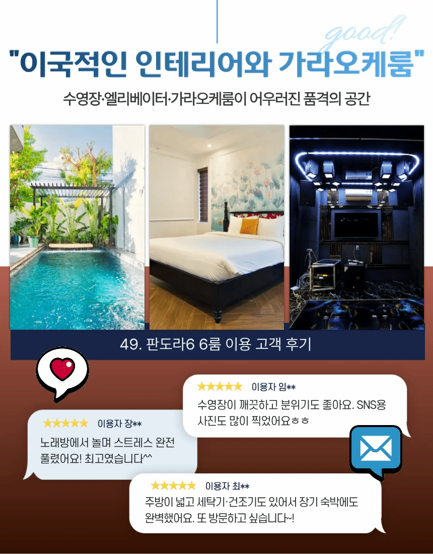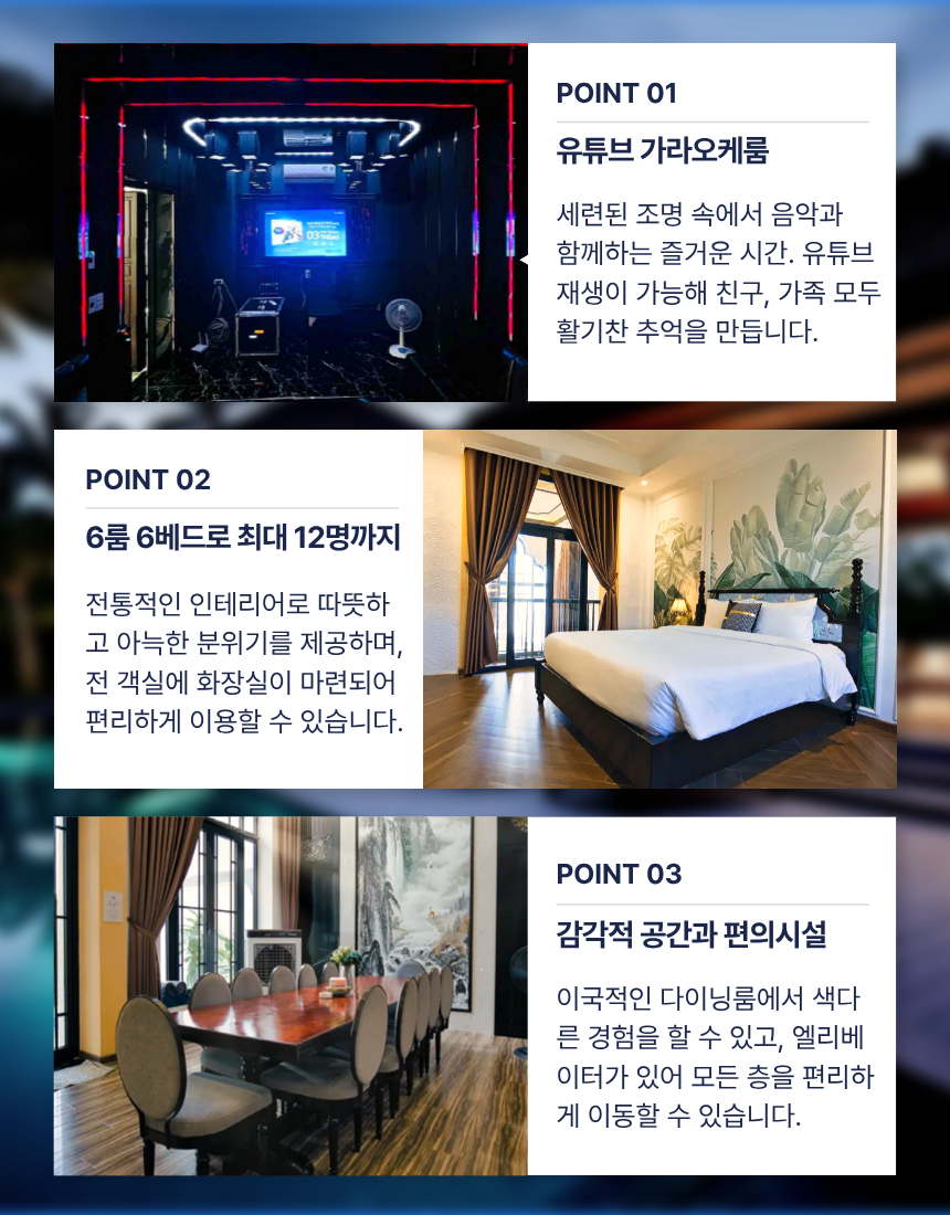 2층·3층에는 객실이 층별로 배치돼 있어 동행 인원끼리 생활 패턴이 달라도 간섭이 적고, 일부 객실은 욕조와 발코니가 포함되어 개인적인 휴식 공간을 확보할 수 있습니다. 상층부에는 연못형 테라스와 세탁·건조 설비가 마련돼 있어 일정 중 필요한 생활 기능이 안정적으로 갖춰져 있습니다. 미케해변·오행산·안트엉거리까지 차량 약 5~10분 거리로 이동이 간단하며, 실내 여가·편의성·도심 접근성을 모두 갖춘 균형 잡힌 풀빌라입니다.🏊♂️🎤