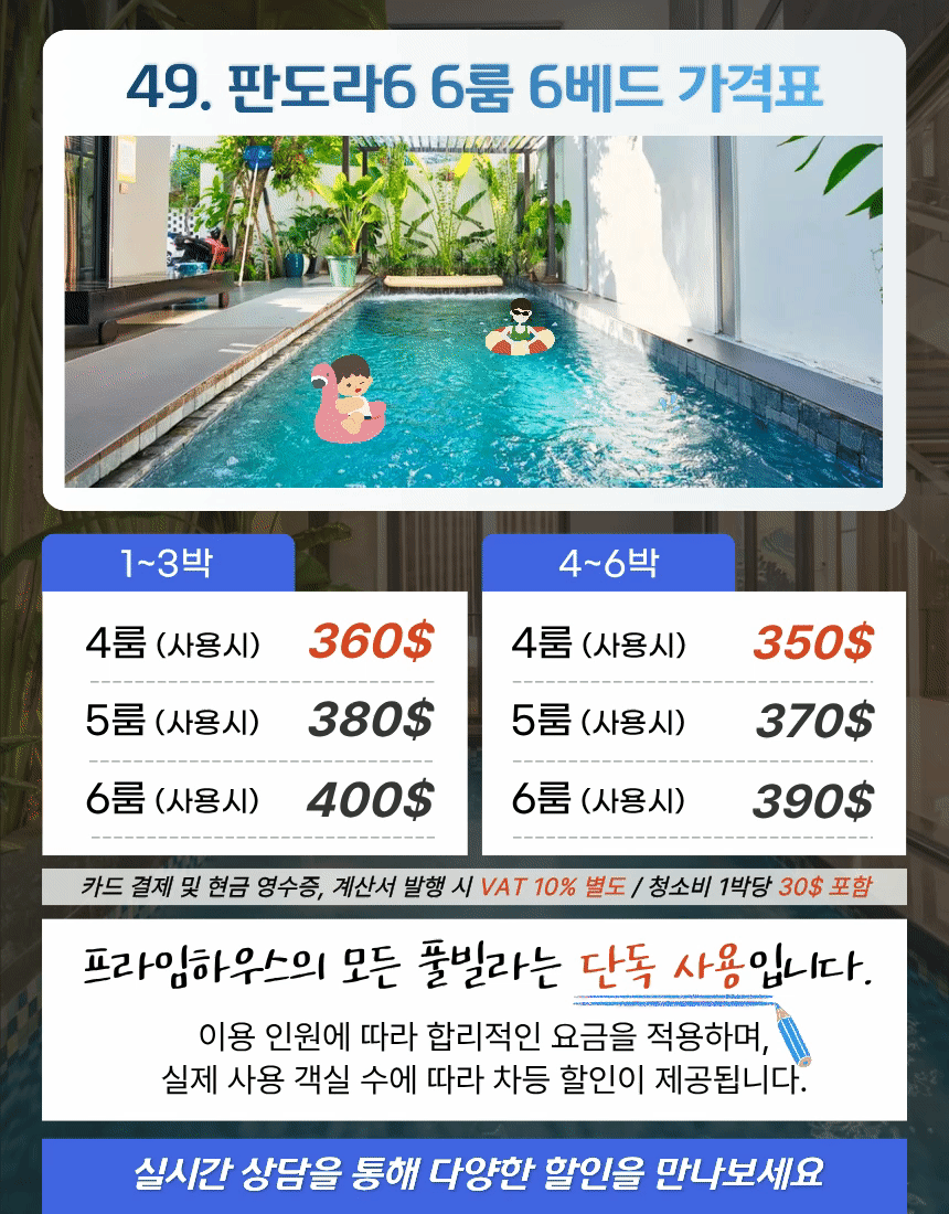 ‘49. 판도라6’는 6룸·6베드·7욕실로 구성된 6층 규모의 도심형 프리미엄 풀빌라입니다. 1층 외부 수영장(9m × 2.8m × 1.6m)은 거실·주방과 가까운 위치에 있어 물놀이 후 휴식·식사 동선이 자연스럽게 이어지며, 같은 층에 가라오케룸(유튜브 재생)이 배치돼 낮과 밤 모두 활용도가 높은 구조입니다. 클래식한 색감과 우드톤 디테일이 조화를 이루는 실내는 차분하고 고급스러운 분위기를 유지하며, 엘리베이터가 설치되어 층간 이동이 부담 없이 편리합니다.