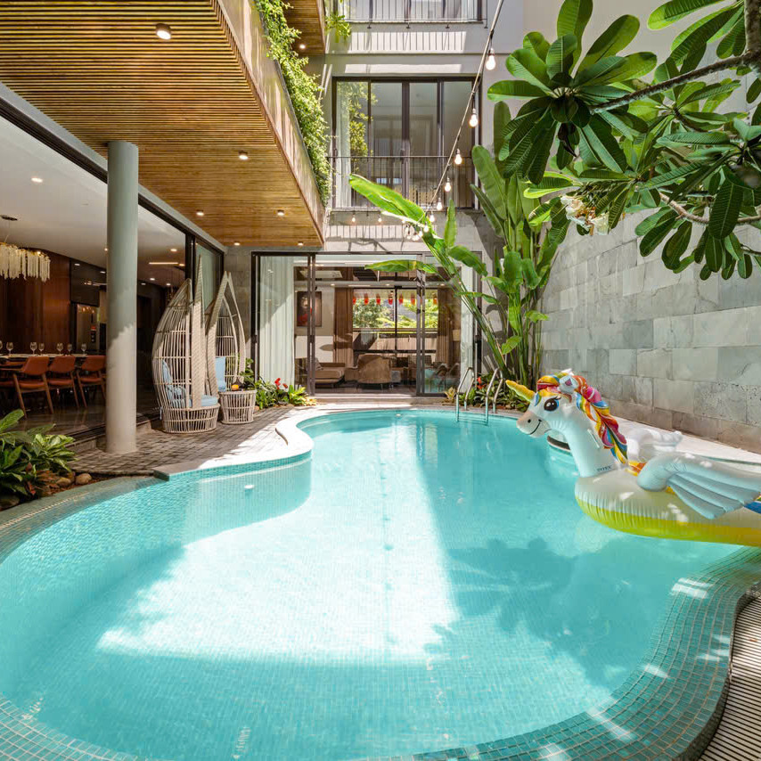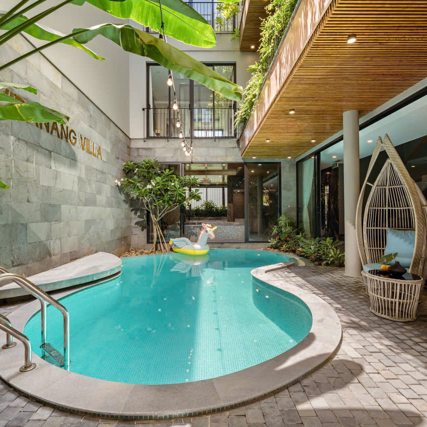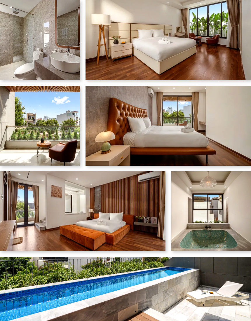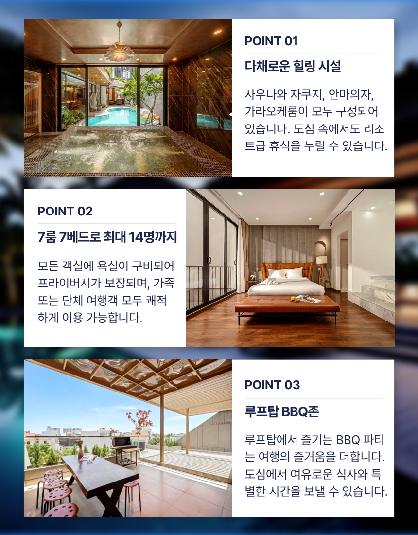 3층에는 가로 8m × 세로 2m × 수심 1.4m의 루프탑형 실외 수영장이 추가로 마련돼 있어, 1층 수영장과 분리된 분위기에서 여유로운 물놀이를 즐길 수 있습니다. 2층 가라오케룸(유튜브 재생), 전용 헬스장, 루프탑 BBQ존 등 부대시설이 층별로 잘 나뉘어 있어 단체·가족 여행에서도 활동과 휴식을 자연스럽게 분리할 수 있습니다. 미케해변·오행산·안트엉거리·롯데마트까지 차량 약 5~10분 거리에 위치해, 해변·관광·식사를 모두 효율적으로 조합할 수 있는 하이엔드 풀빌라입니다.🌿🏊♂️