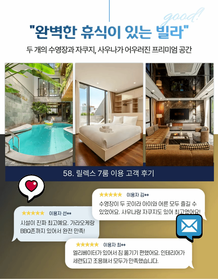 | 공항 픽업 / 샌딩 서비스 | 다낭 공항 → 풀빌라 간 전용 차량 이동 | 유튜브 구독 & 네이버 카페 회원 전용 |